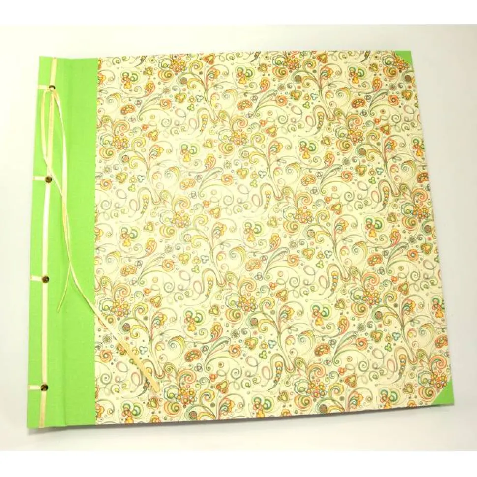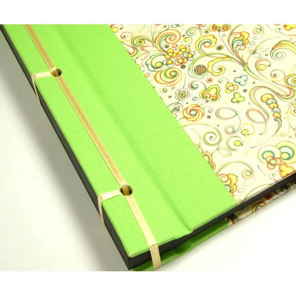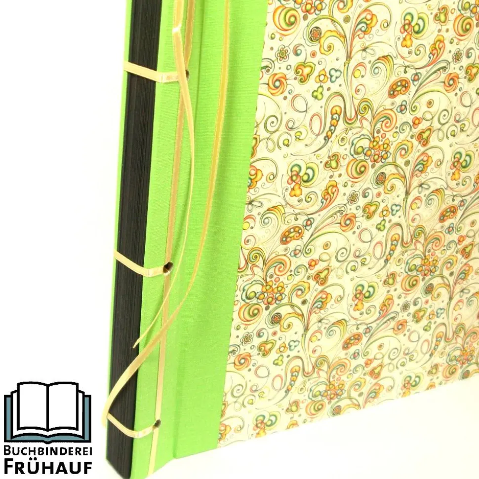 Rücken und Ecken sind aus grünem Buchbinderleinen und das Überzugspapier ist Italienisches Buntpapier.