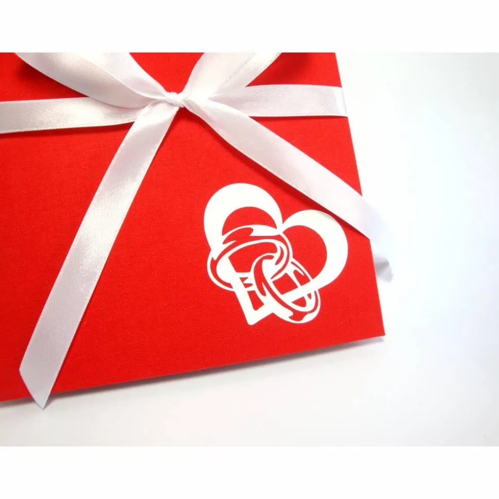 Die Deckel des Leporellos sind aus Buchbinderpappe, mit rotem Buchbinderleinen überzogen. Das Herz mit den Eheringen ist aus weißer Flexfolie.