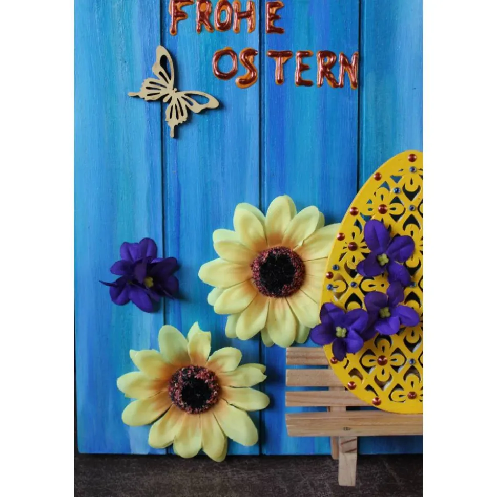 Auf Holz gestaltete Collage mit einer kleinen Holzbank. Kunstblumen, Holzornament in Ei-Form, Glitzersteinchen und Schmetterlingen aus Holz. Bemalt mit Acrylfarben.