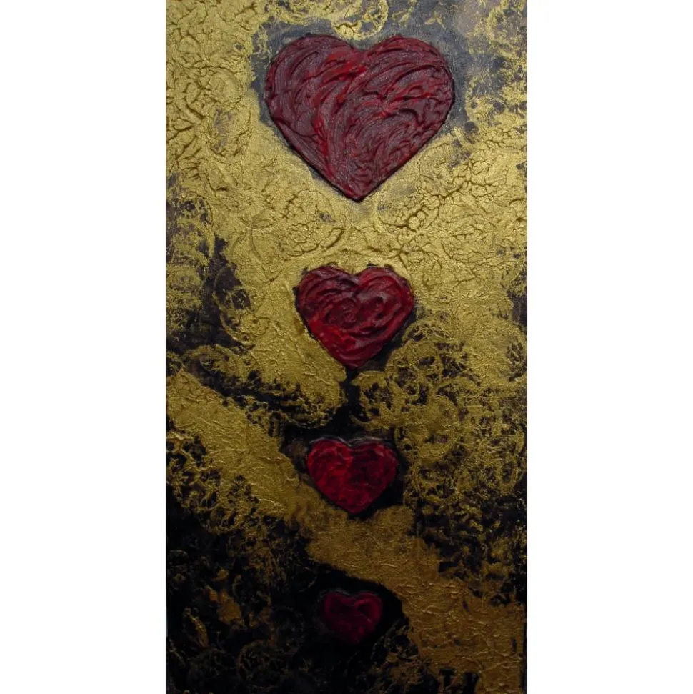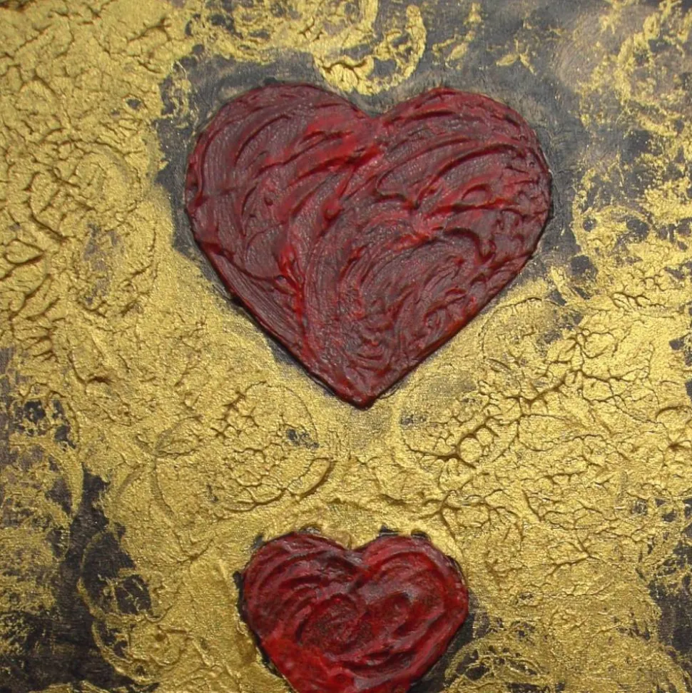 Acrylfarben in kräftigem Rot, Gold und Schwarz auf einem Keilrahmen. Durch den dicken Farbauftrag und die Verwendung von Spachtelmasse entstehen tolle Effekte. Oppulent in Gold schillernd ist dieses Bild ein Hingucker in jeder Wohnung.