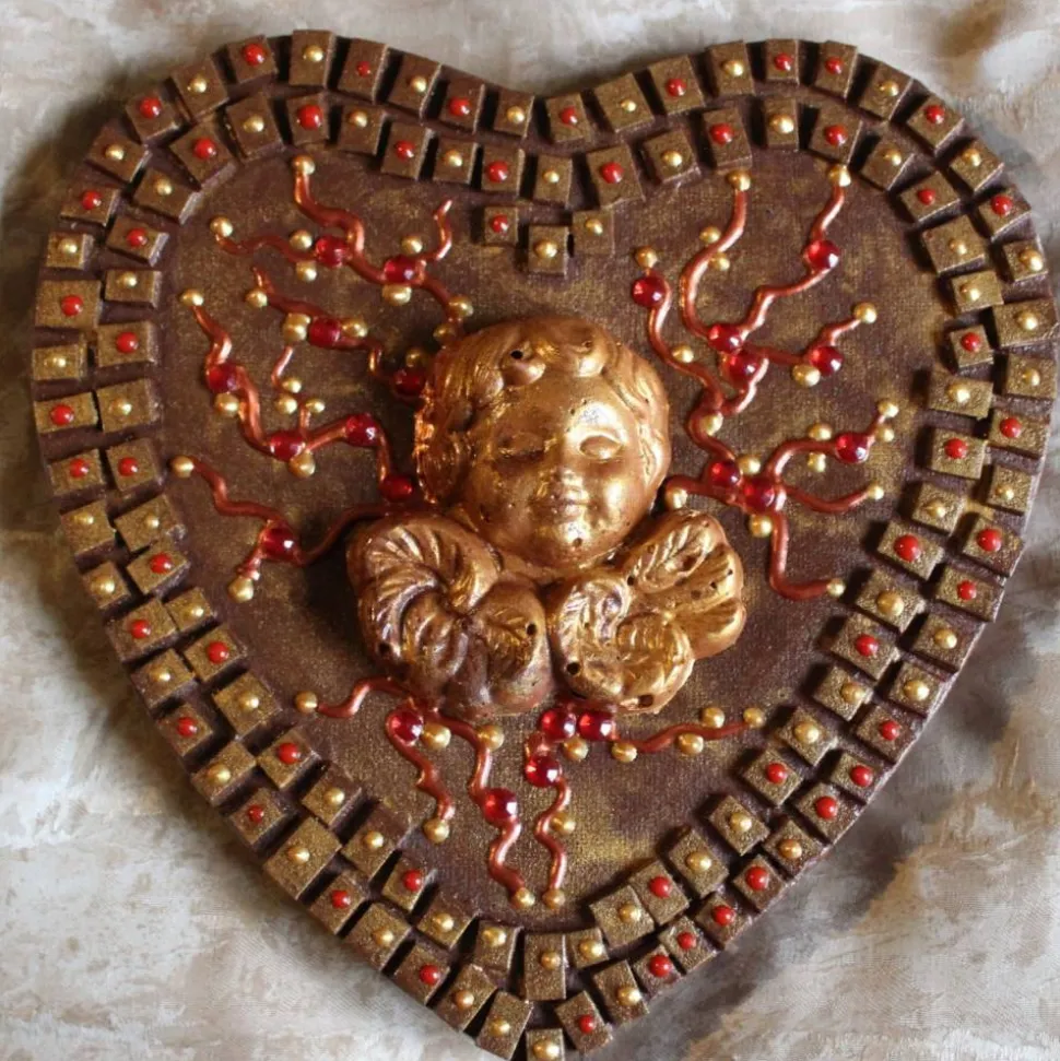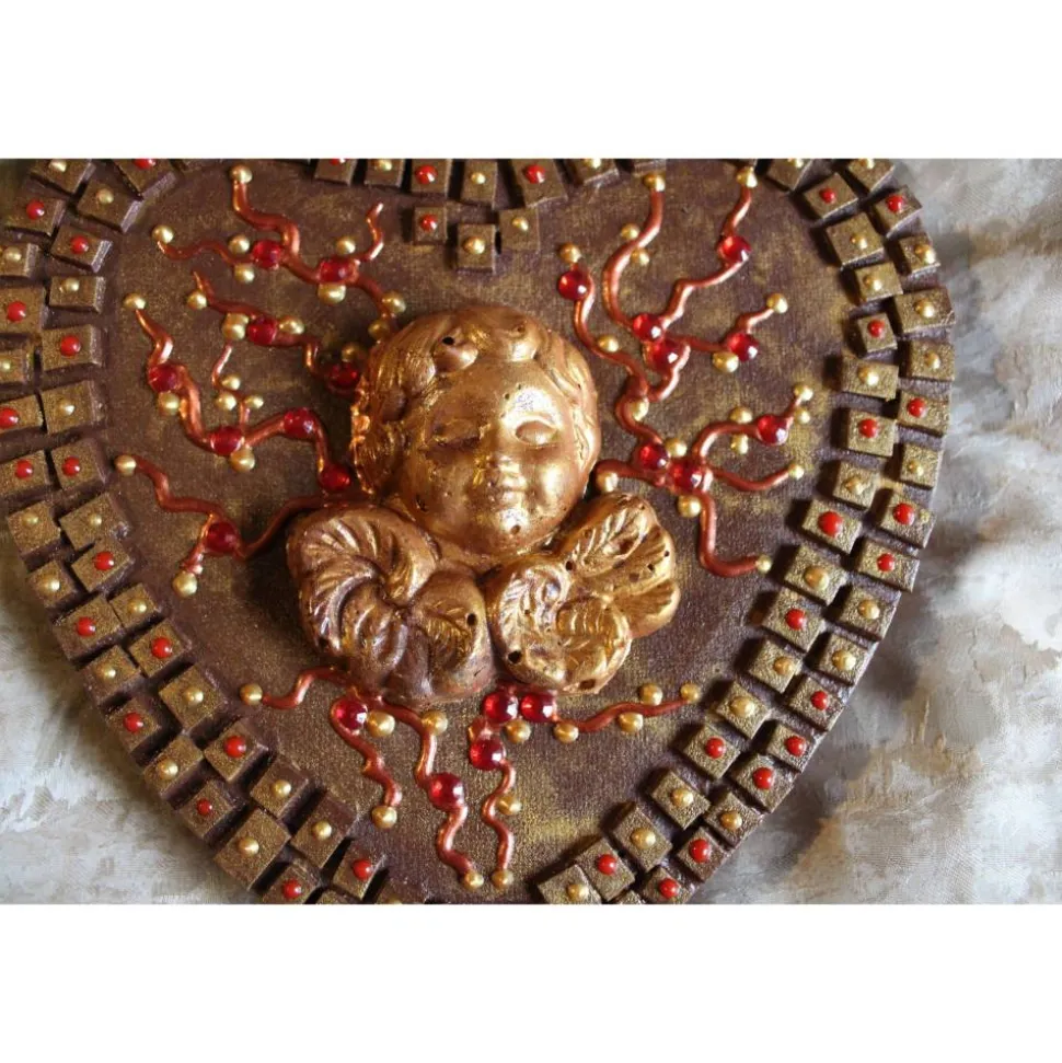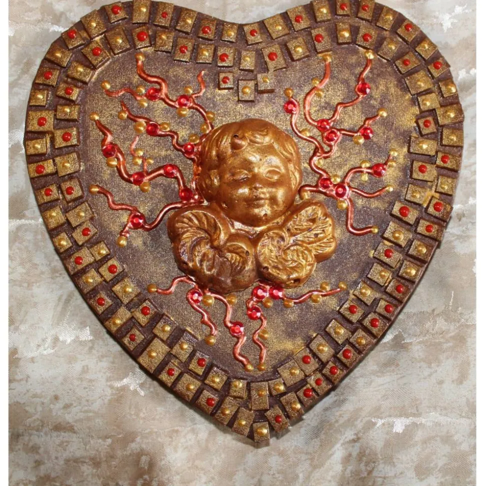 Engel aus Beton gegossen, auf einem herzförmigen Keilrahmen. Durch die Lufteinschlüsse im Beton ist ein schöner zerklüfteter Effekt entstanden, der den Engel wie eine alte, verwittertes Relief aussehen lässt.