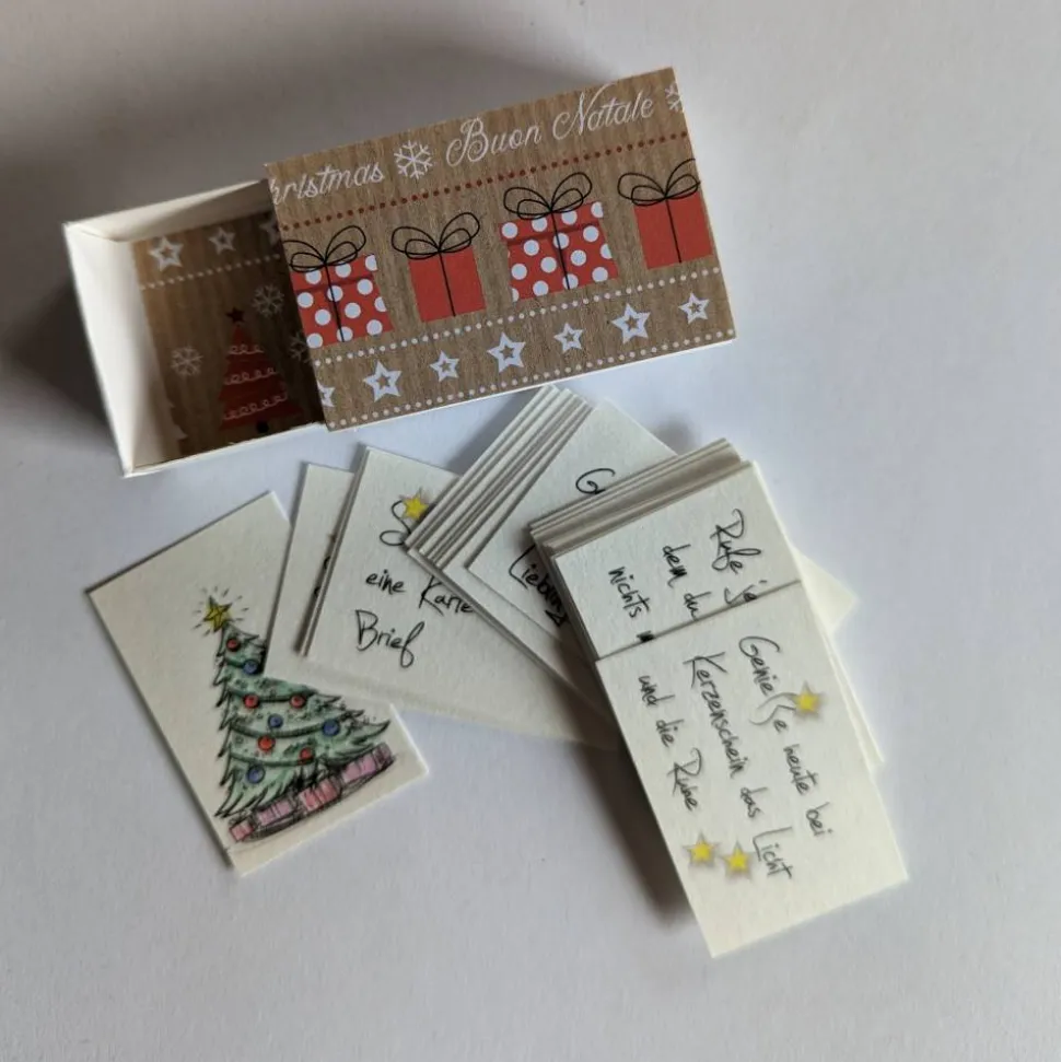 Eine weihnachtliche verzierte Streichholzschachtel mit 24 kleinen Kärtchen. Auf den Minikärtchen sind Dinge aufgeschrieben, die einen den Tag erhellen sollen. Aufgaben die einem selbst guttun, oder auch anderen…