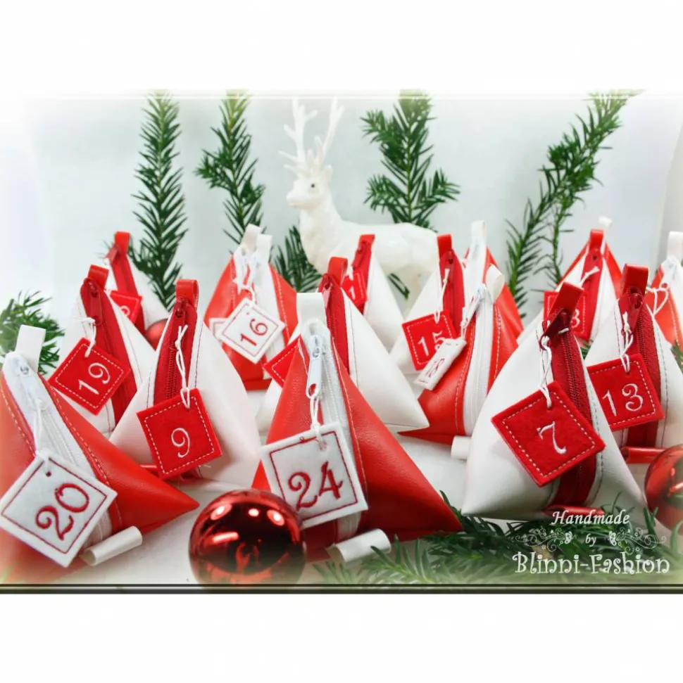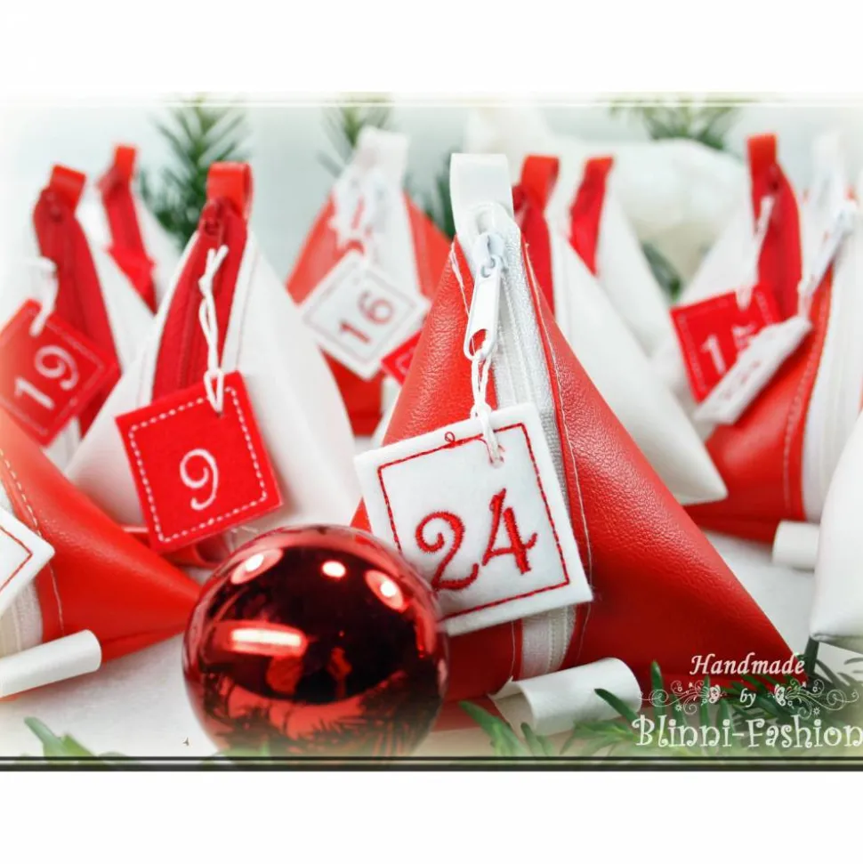 Die Adventskalender-Pyramiden sind aus Nappaleder-Imitat genäht und werden mit einem Reißverschluß geschlossen. Durch die eingenähte Schlaufe lassen sich Die Adventskalender-Säckchen prima auch aufhängen.