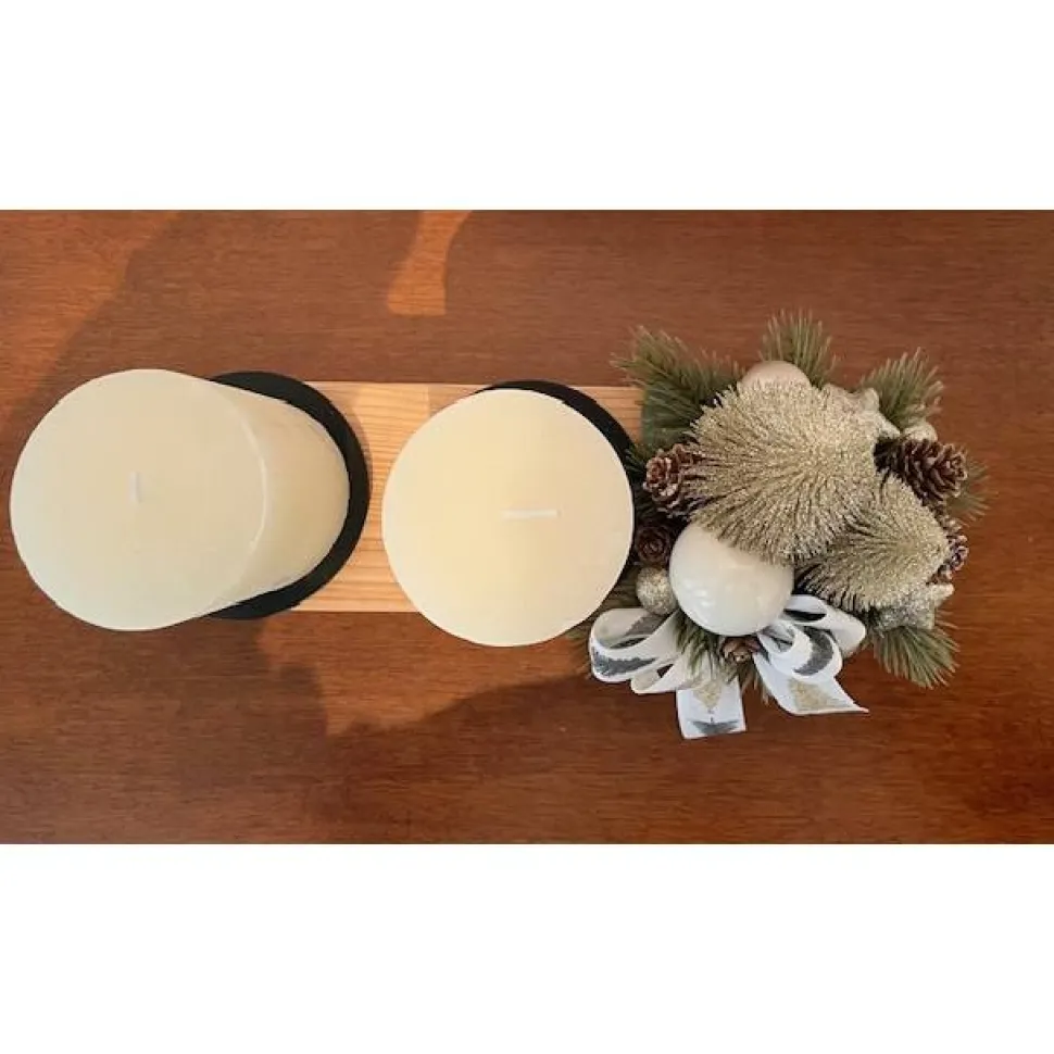 Dekoriert ist das Gesteck mit zwei goldfarbenen Glitzertannenbäumchen, künstlicher