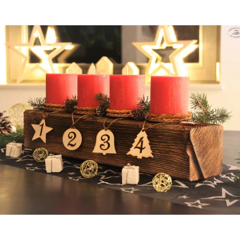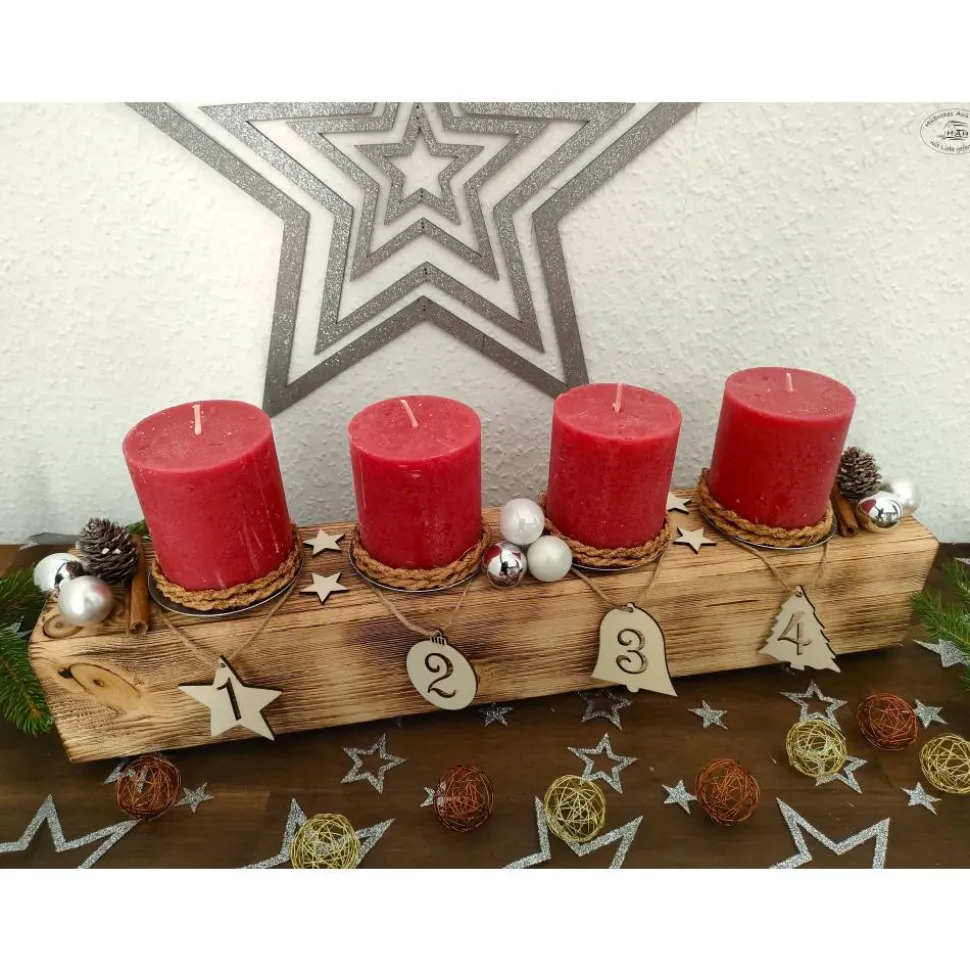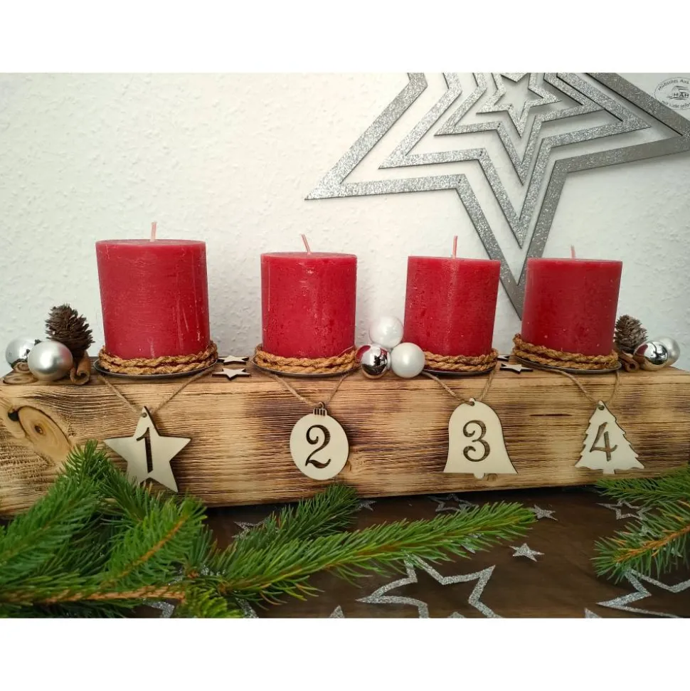 Adventsbalken / Adventskranz / Adventsgesteck aus Holz mit roten Kerzen auf silbernen Kerzentellern, dekoriert mit Zahlenanhängern aus Holz, Glaskugeln, Hanfschnur, Kokosgarn, Holzsternen, Tannenzapfen und hochwertigen Filzgleitern (für eine bessere Standfestigkeit und Schonung der Stellfläche).