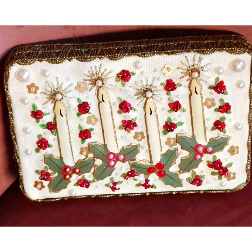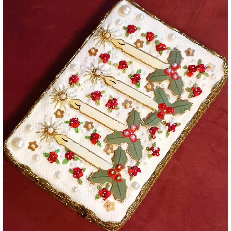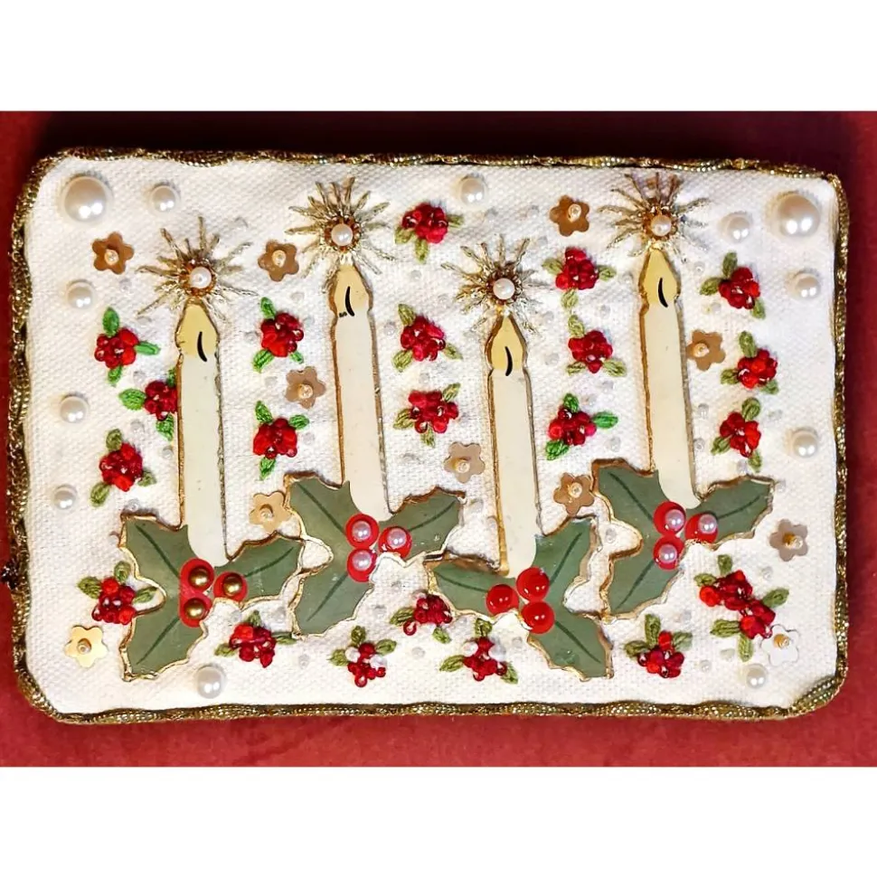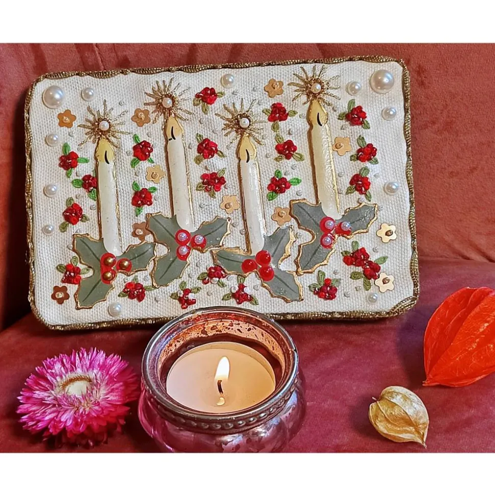 Diese exklusive Adventsdekoration kombiniert handgefertigte Kunst mit hochwertigem Naturmaterial. Auf naturweißem Leinenstoff sind vier zierliche Adventskerzen aus handbemalter Emaille angebracht, liebevoll umgeben von gestickten roten Blümchen, cremeweißen Perlen und kleinen goldenen Pailletten.