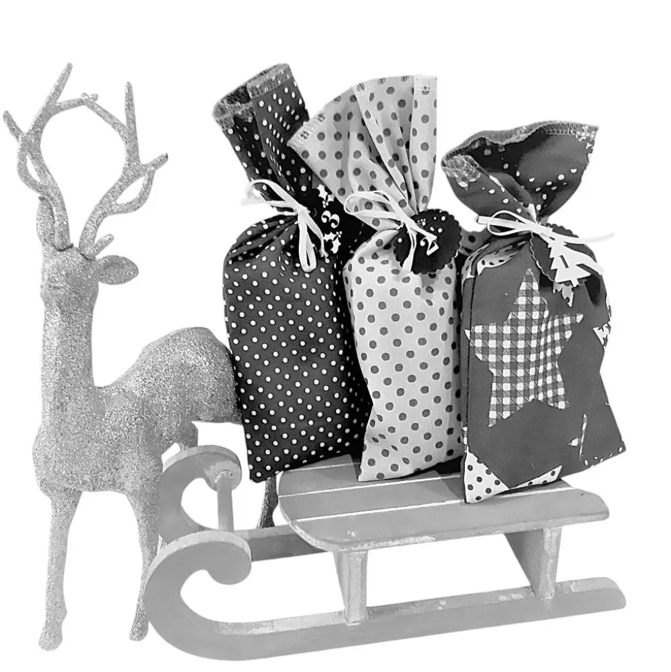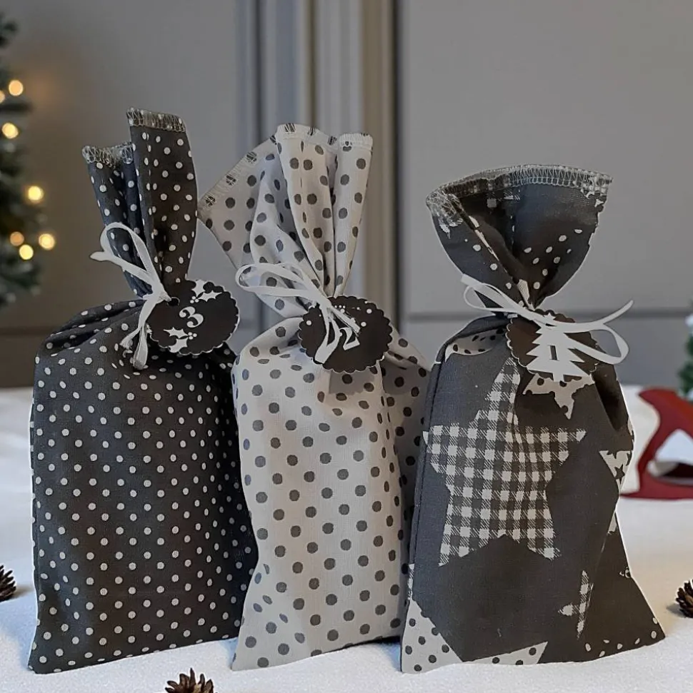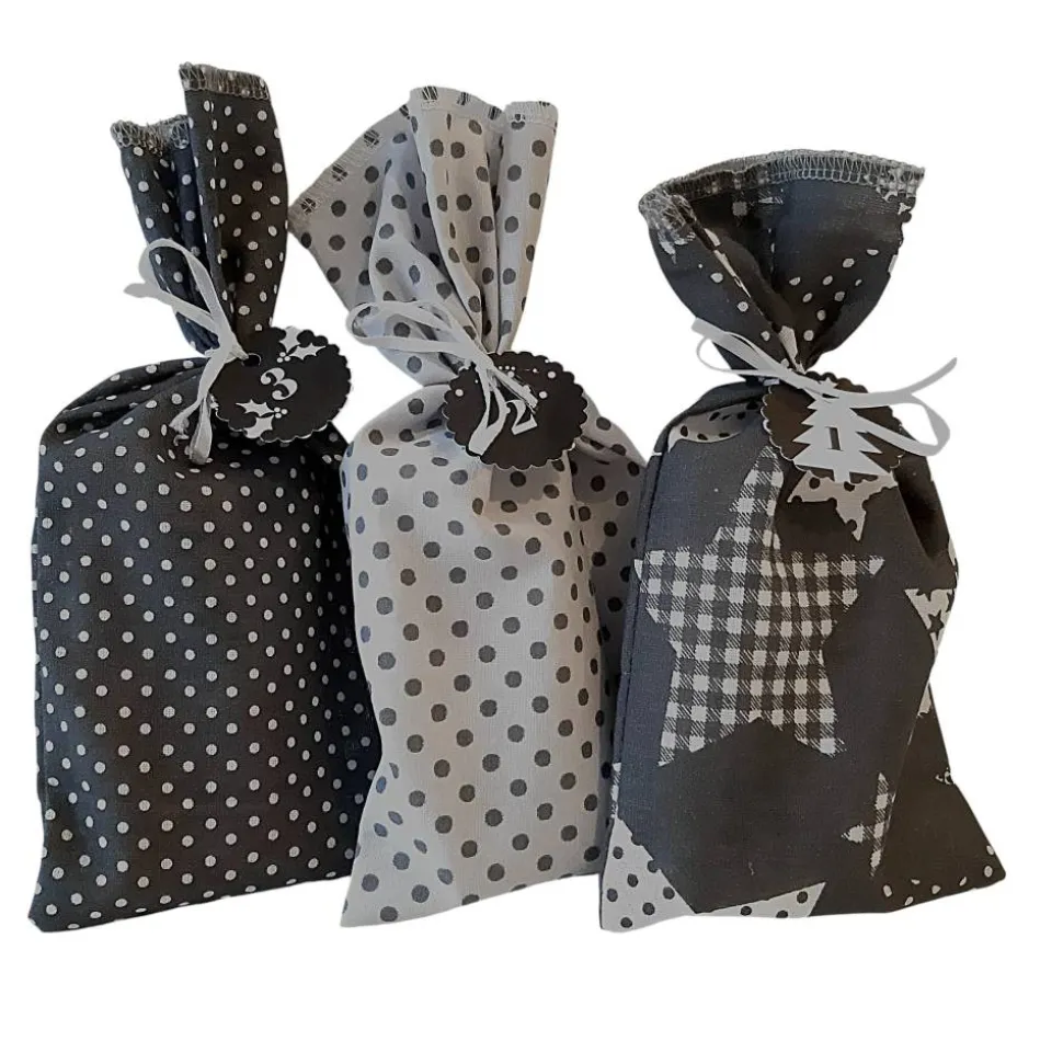 – 8 Säckchen grau mit weißen Punkten, 100% Baumwolle