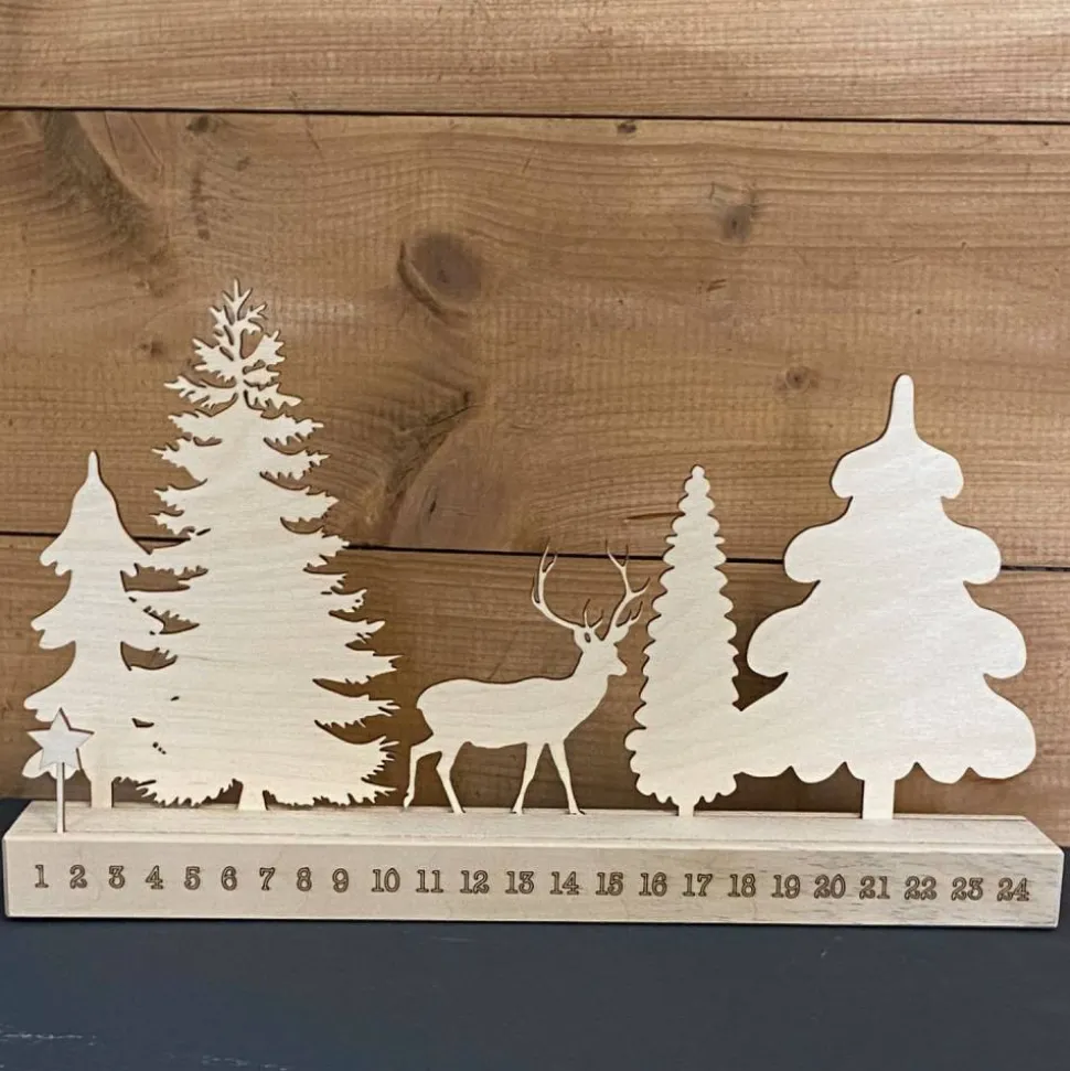 Hochwertige Materialien & skandinavisches Design: Die Waldszene und der Steck-Stern bestehen aus 3mm starkem, unbehandeltem Birkensperrholz. Die Leiste ist aus unbehandeltem Massivholz gefertigt. Mit einer Breite von ca. 30cm und einer Höhe von ca. 15cm passt der Adventskalender perfekt in jedes Zuhause.
