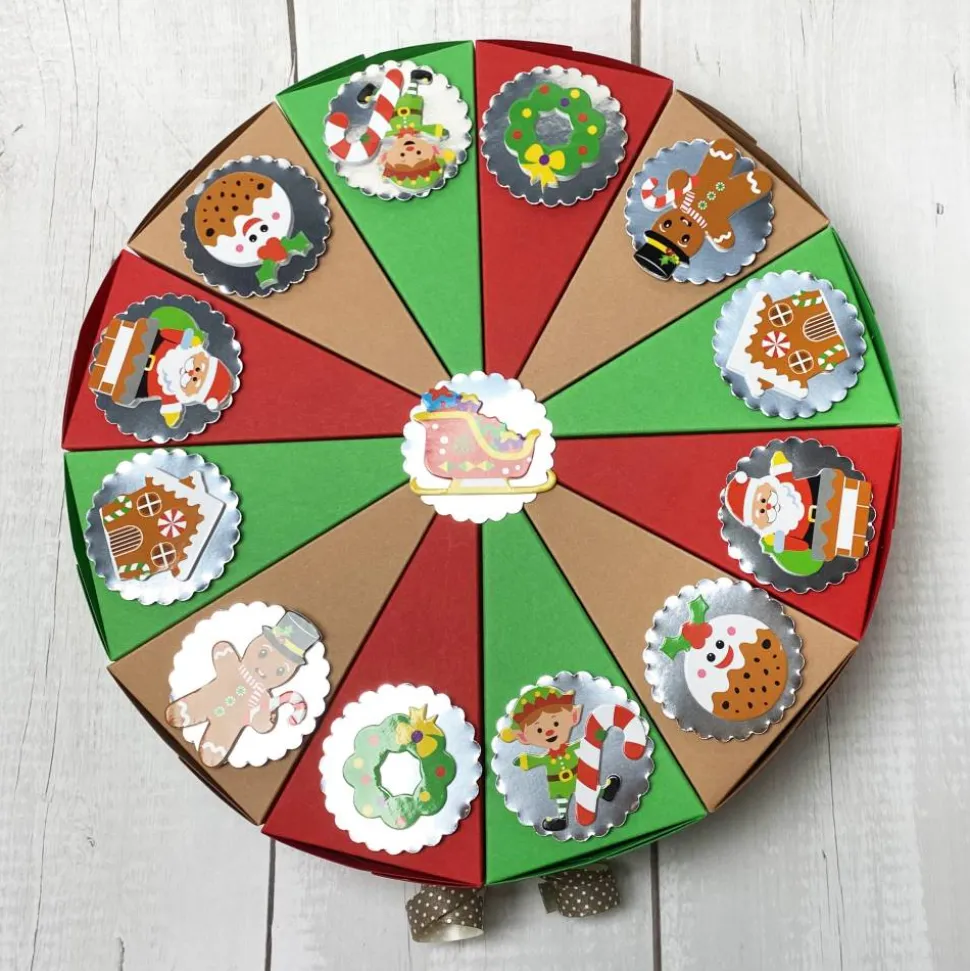 Diese als zweistöckige Torte arrangierte Adventskalender Verpackung ist mit Zahlen von 1 bis 24 versehen, so dass Sie für jeden Tag in der Adventszeit ein separates Geschenkfach haben. Die beiden Stockwerke sind mit einer Band, hübschen Figuren und mit hübschen Motive je nach Thema dekoriert.