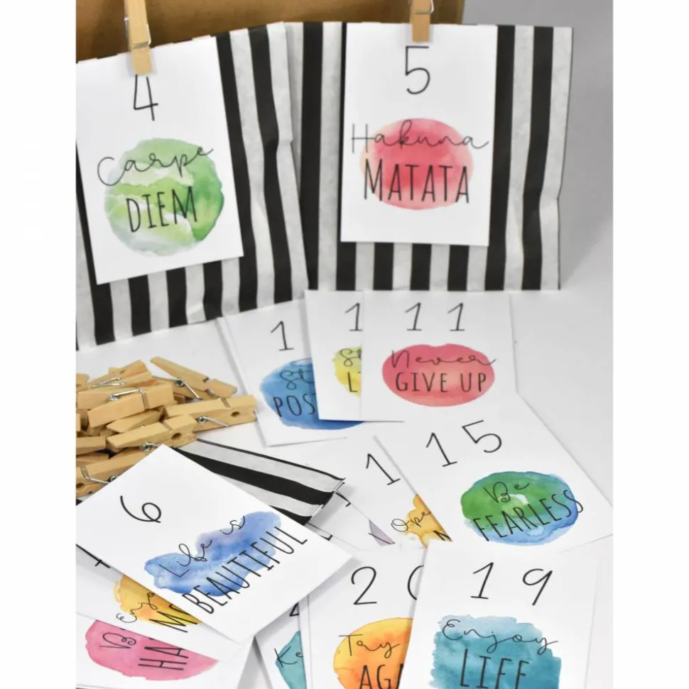 Adventskalender DIY mit Kraftpapiertüten, Zahlen und Holzklammern mir spirituellen Motiven