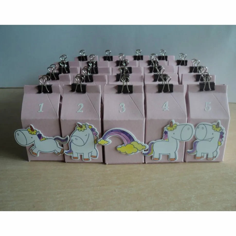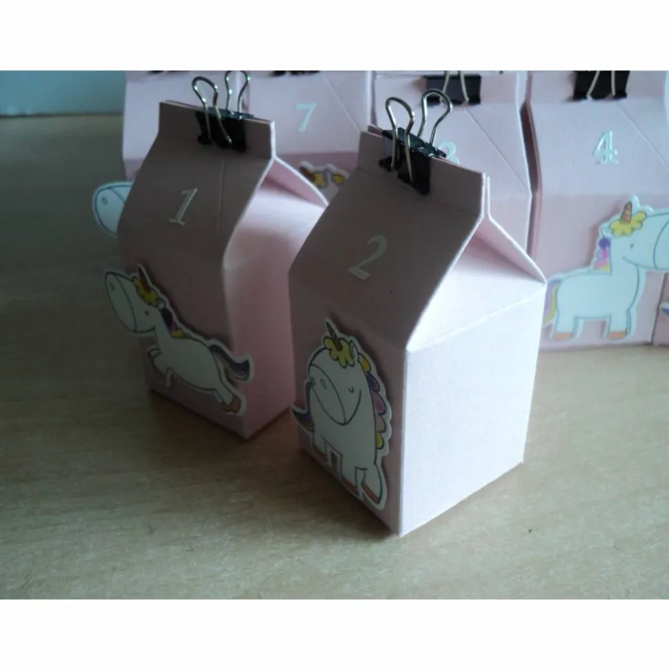 Hier seht ihr einen schönen Adventskalender Weihnachtskalender von mir gestanzt,gestempelt und von Hand coloriert Motiv mit süssem Einhorn/Unicorn 24 stück Milchschachteln mit Klemmen
