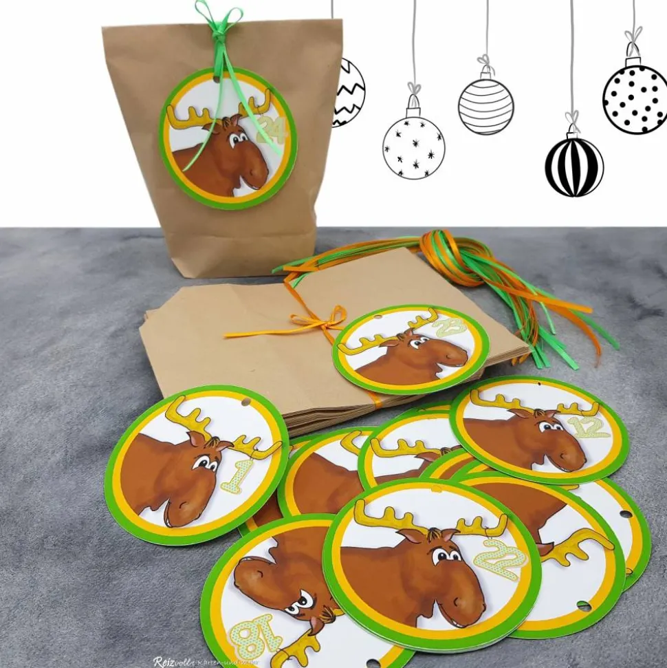 Das Set beinhaltet 24 Kraftpapier-Bodenbeutel (ca. 14,5 x 15,5 cm), 24 Zahlenanhänger mit Elch sowie 24 Satinbänder in grün und orange (je ca. 36 cm). Besorge nur noch 24 kleine Überraschungen und beginne direkt mit dem Befüllen und Dekorieren. Die Kombination aus Kraftpapier, farbenfrohen Satinbändern und den niedlichen Elch-Anhängern macht diesen Adventskalender zu einem echten Blickfang.