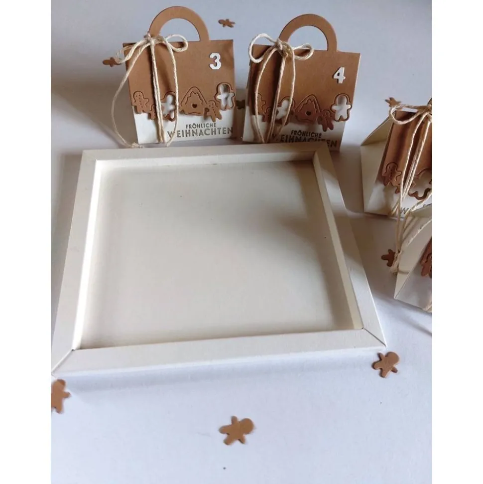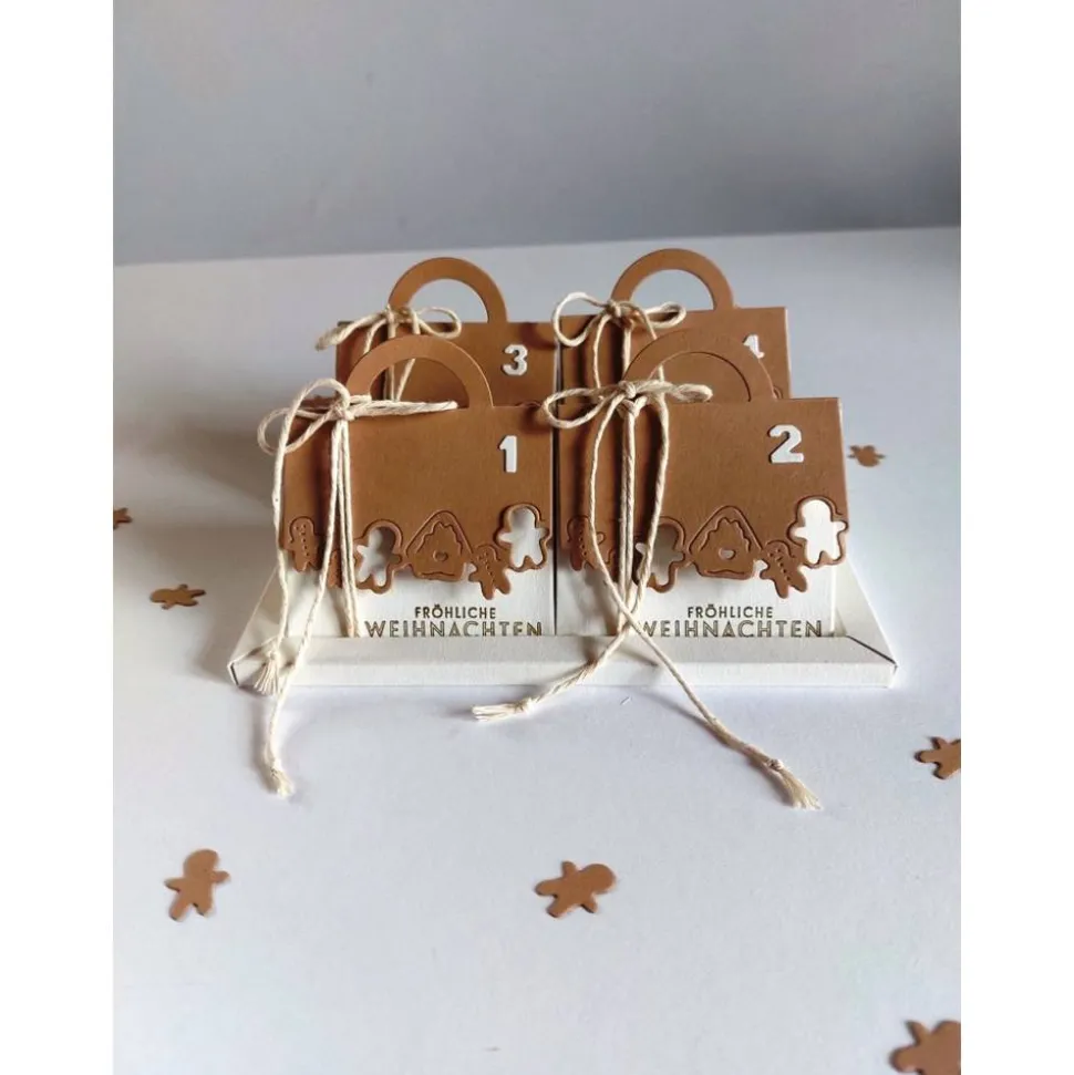 Gestalte jede Box individuell mit kleinen Geschenken, Süßigkeiten, persönlichen Botschaften oder Grüßen. Der Kalender besteht aus stabilen Dreiecksboxen, die aus hochwertigem Tonkarton gefertigt und mit einem weihnachtlichen Gruß bestempelt sind. Verschlossen werden die Boxen mit einer Schnur, der Klappenverschluss mit kleinem Henkel ist mit festlichen Motivausstanzungen verziert.