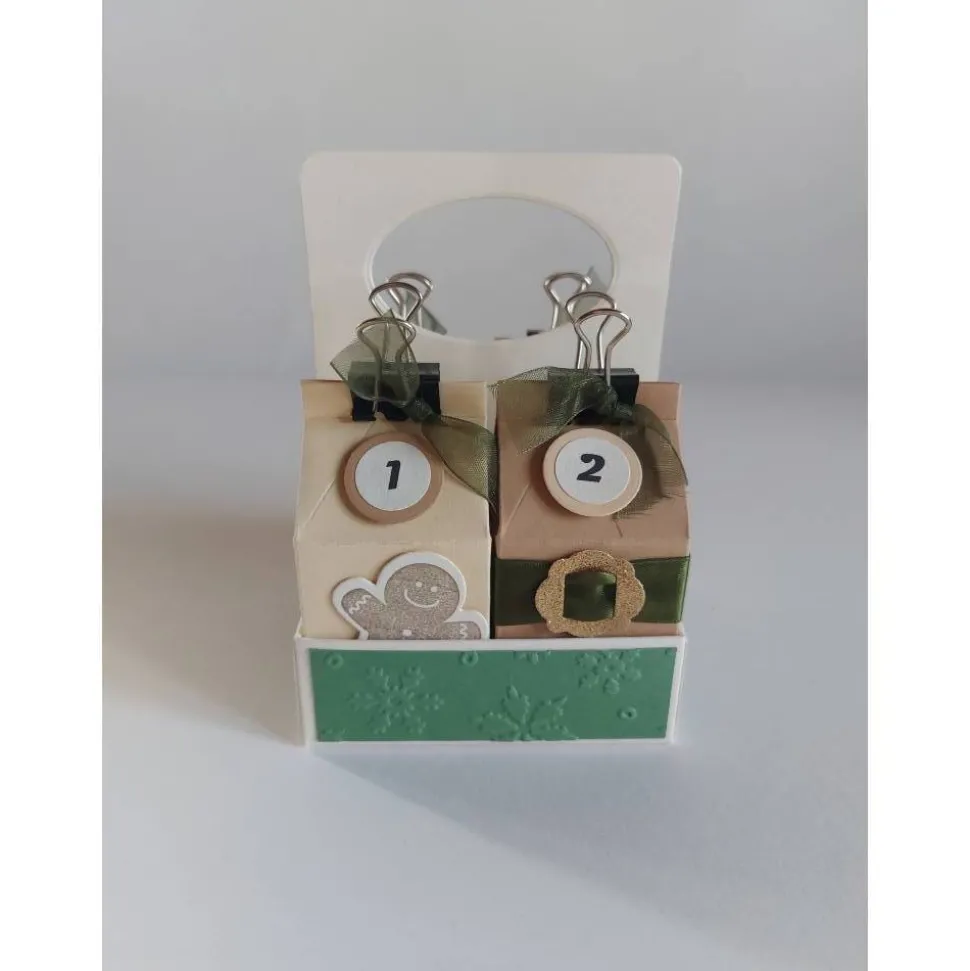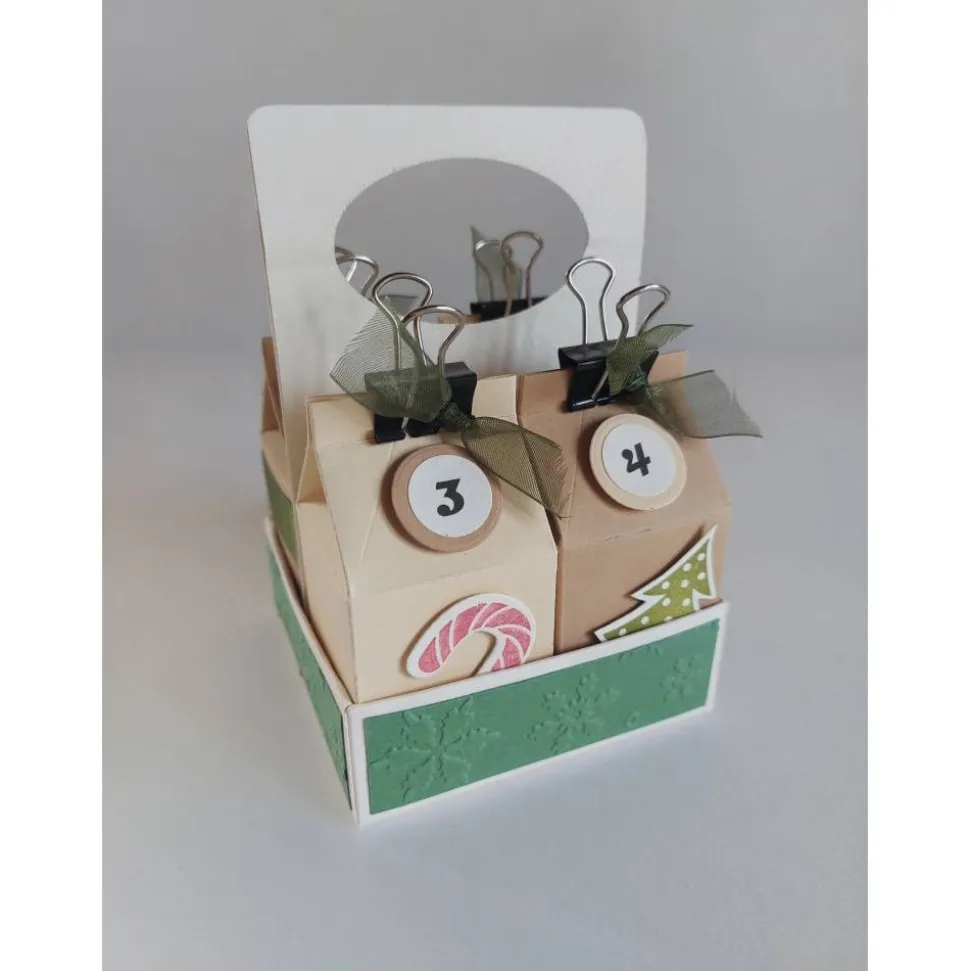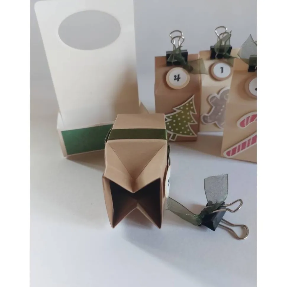 Gefertigt aus Tonkarton, Maulyklammern, Satinband, Organzaband, Glitzerpapier, Kleber, Stempelfarbe und 3D-Pads. Jede Box wurde gestanzt, gefalzt, geklebt und das Rondell bedruckt – so entsteht ein Adventskalender, der nicht nur praktisch, sondern auch ein echter Hingucker ist.