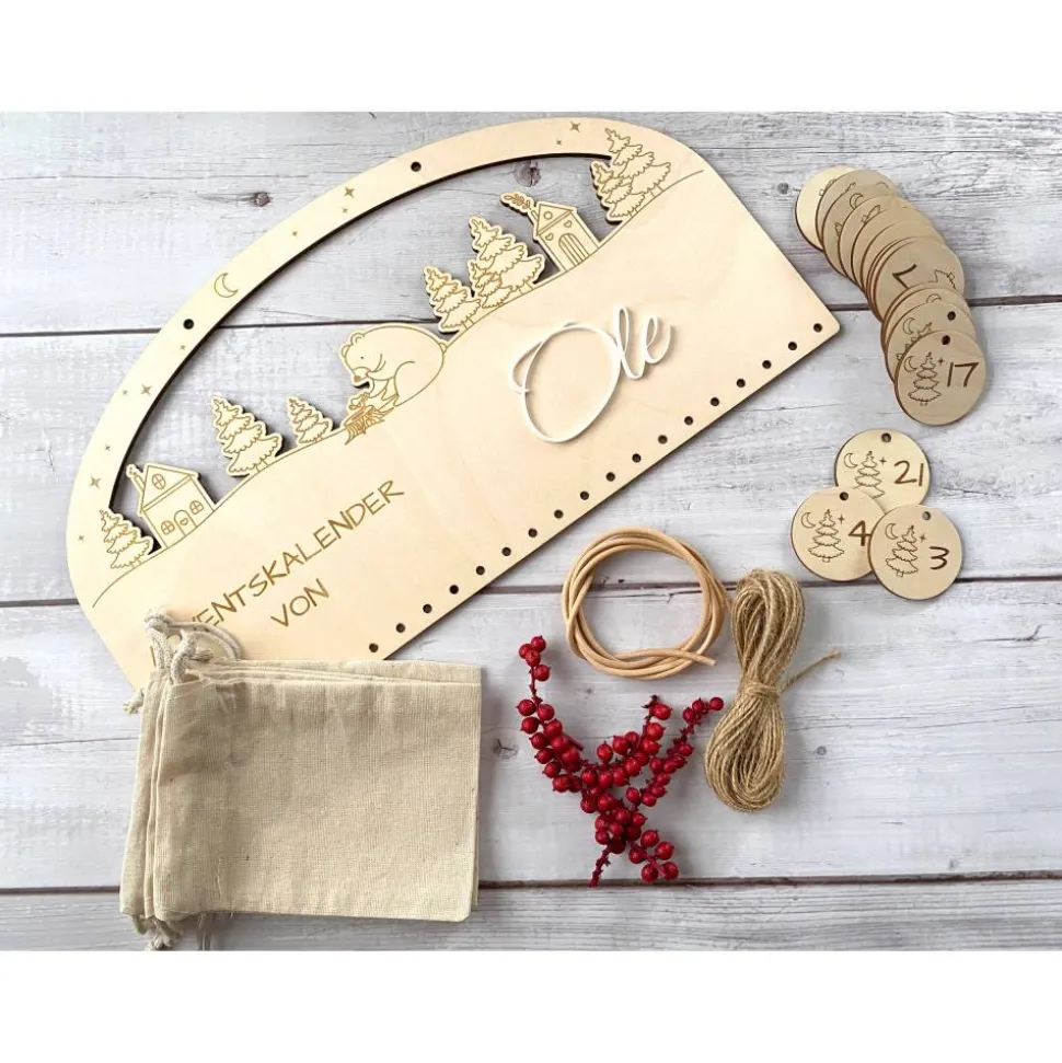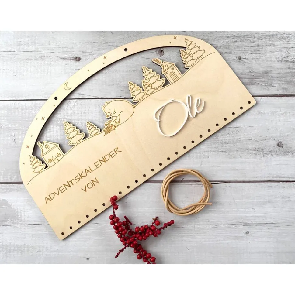 Unser Adventskalender aus 4 mm Birkensperrholz zeigt eine feineWinterlandschaft mit Bär. Der Name wird aus weißem Acryl gelasert und als3D-Schrift aufgesetzt – langlebig, gut lesbar und ein echter Hingucker imKinderzimmer. Dank sauberer Lasergravur, 60 cm Lederband zur Aufhängung und 24Befestigungslöchern unten lässt sich der Kalender schnell bestücken und jedesJahr wiederverwenden.