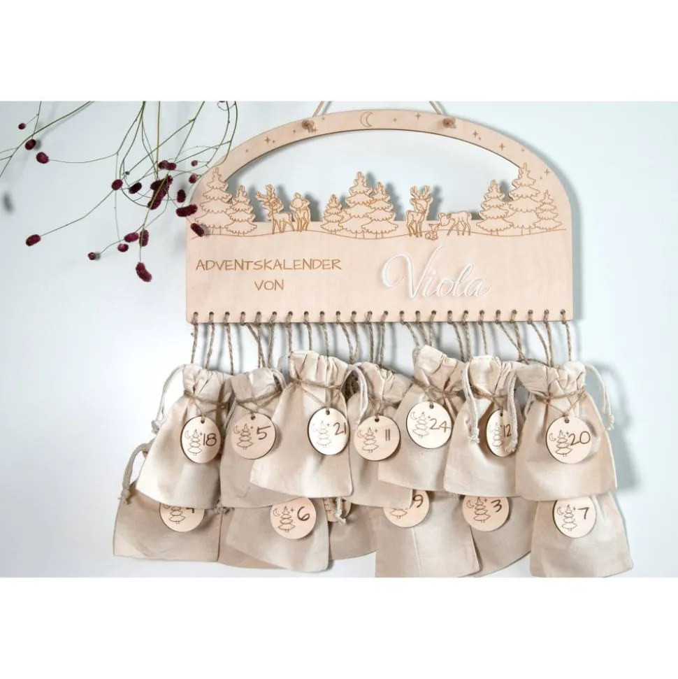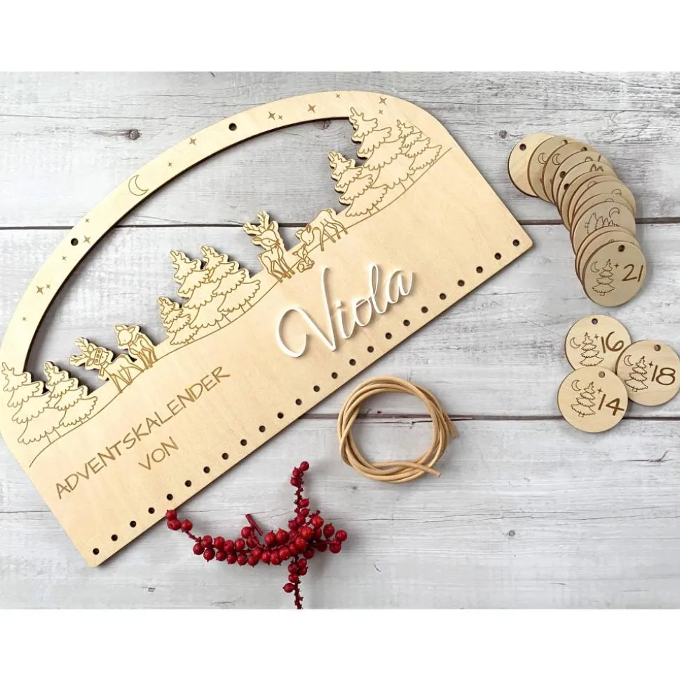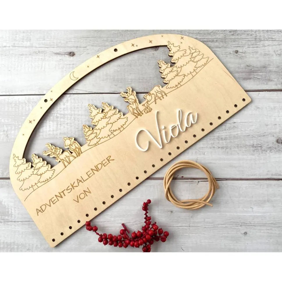 Schlicht, nordisch und persönlich: DieserAdventskalender aus 4 mm Birkensperrholz zeigt eine feine Winterlandschaft mitRehen. Der Name wird aus weißem Acryl gelasert und als 3D-Schrift aufgesetzt –gut lesbar, robust und Jahr für Jahr wieder schön. Das Brett wird präzisegelasert, sorgfältig geschliffen und kommt mit einem 60 cm Lederband (Ø3 mm).Oben befindet sich ein Aufhängeloch Ø5 mm, unten Reihen von Ø4 mm-Löchern zumBefestigen der Beutel oder Zahlenanhänger.