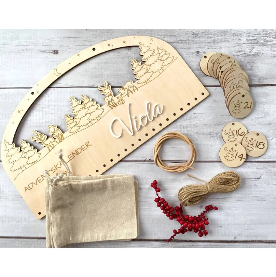 • Kalenderbrett + Zahlen: zusätzlich 24 gravierte Zahlenanhänger (3 mm Birke,Ø4 mm Loch).