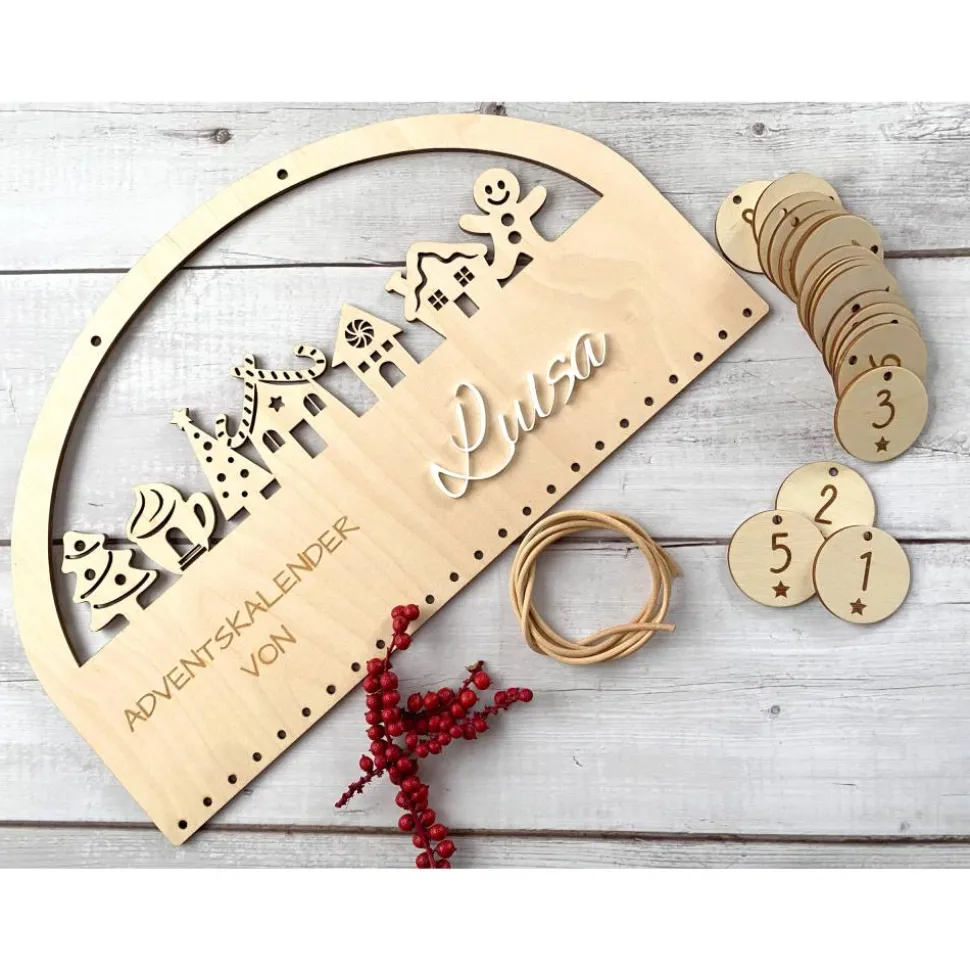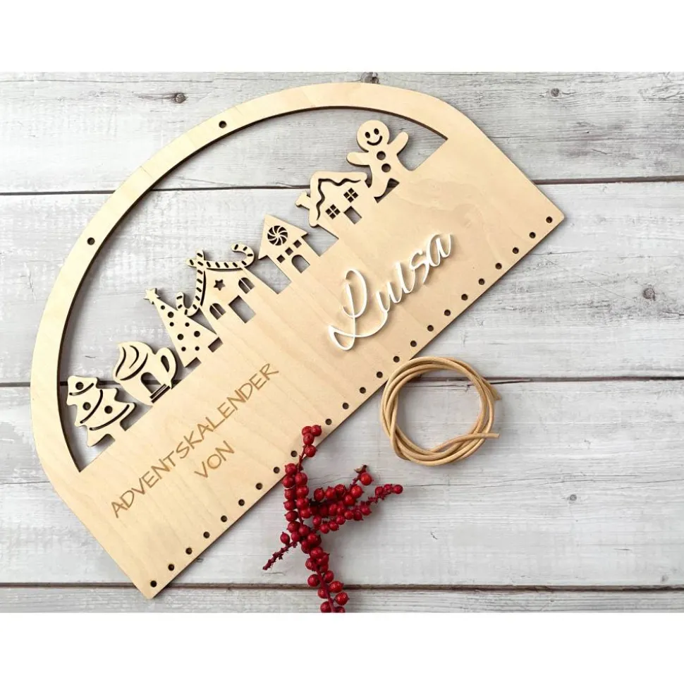 Dieser Adventskalender wird aus 4 mm Birkensperrholz gefertigt und zeigt einefiligrane Reihe Lebkuchenhäuser. Der Wunschname wird aus weißem Acryl gelasertund als 3D-Schrift aufgesetzt – gut lesbar und robust. Dank der klarenFormensprache passt das Brett hervorragend zu skandinavischerWeihnachtsdekoration und begleitet viele Adventszeiten.