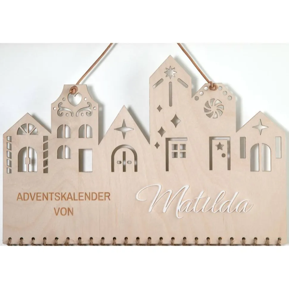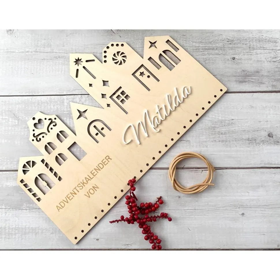 Klar, modern, skandinavisch: Der Adventskalender„Weihnachtsstadt“ setzt auf reduzierte Formen und eine zeitlose Silhouette. DasBrett wird aus 4 mm Birkensperrholz gelasert; der Namenszug ausweißem Acryl ist aufgesetzt und sorgt für eine dezente 3D-Wirkung. Mit dem Lederband(60 cm, Ø 3 mm) lässt sich der Kalender direkt aufhängen – oben befindetsich ein Aufhängeloch Ø 5 mm, unten Befestigungslöcher Ø 4 mm fürBeutel, Klammern oder Zahlenanhänger.