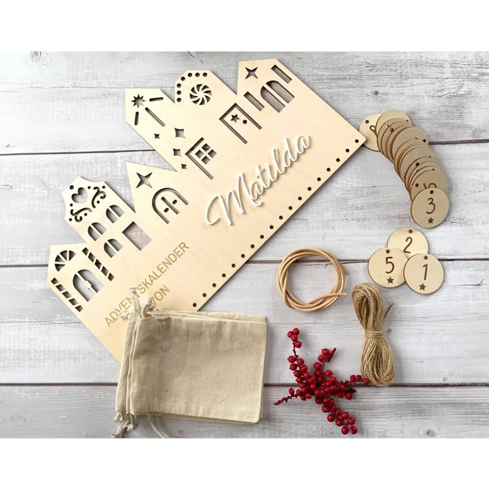 - Brett + Zahlen: Zusätzlich 24 runde Holzanhänger (3 mm Birke) mit ausgestanztem Stern + Zahlen 1–24, Loch Ø 4 mm.