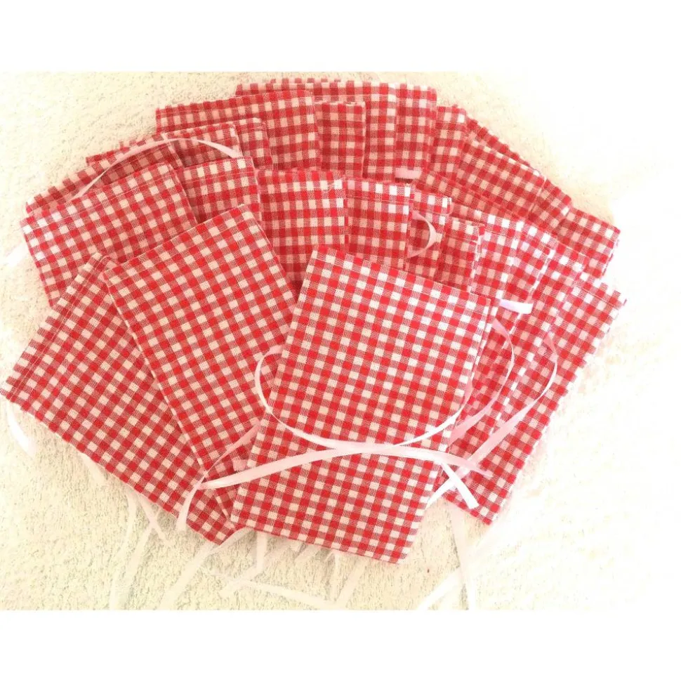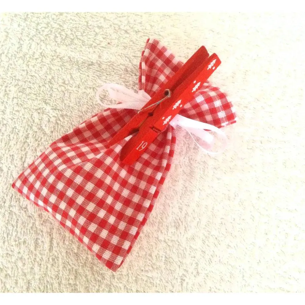 Die rot-weiß-karierten Säckchen können mit einem weißen Satinband geschlossen werden. Das Satinband ist an der Rückseite an jedem Säckchen angenäht, damit können die Säckchen auch beliebig aufgehängt werden.
