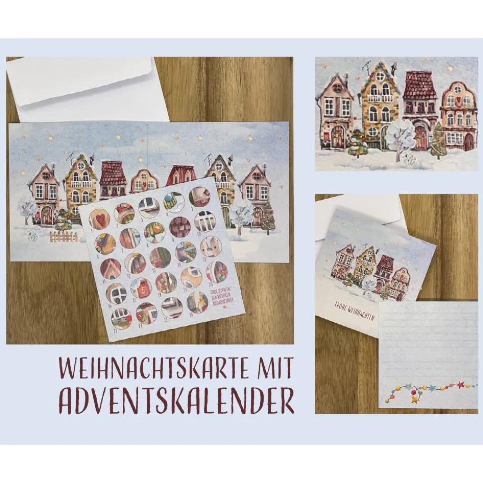 Beim Aufklappen zeigt die Karte ein detailreiches Winter-Wimmelbild, das jeden Tag im Advent ein neues kleines Rätsel bereithält. Die beiliegende Einlegekarte enthält 24 Suchbilder, die im Wimmelmotiv entdeckt werden können, und bietet gleichzeitig Platz für einen persönlichen Gruß.