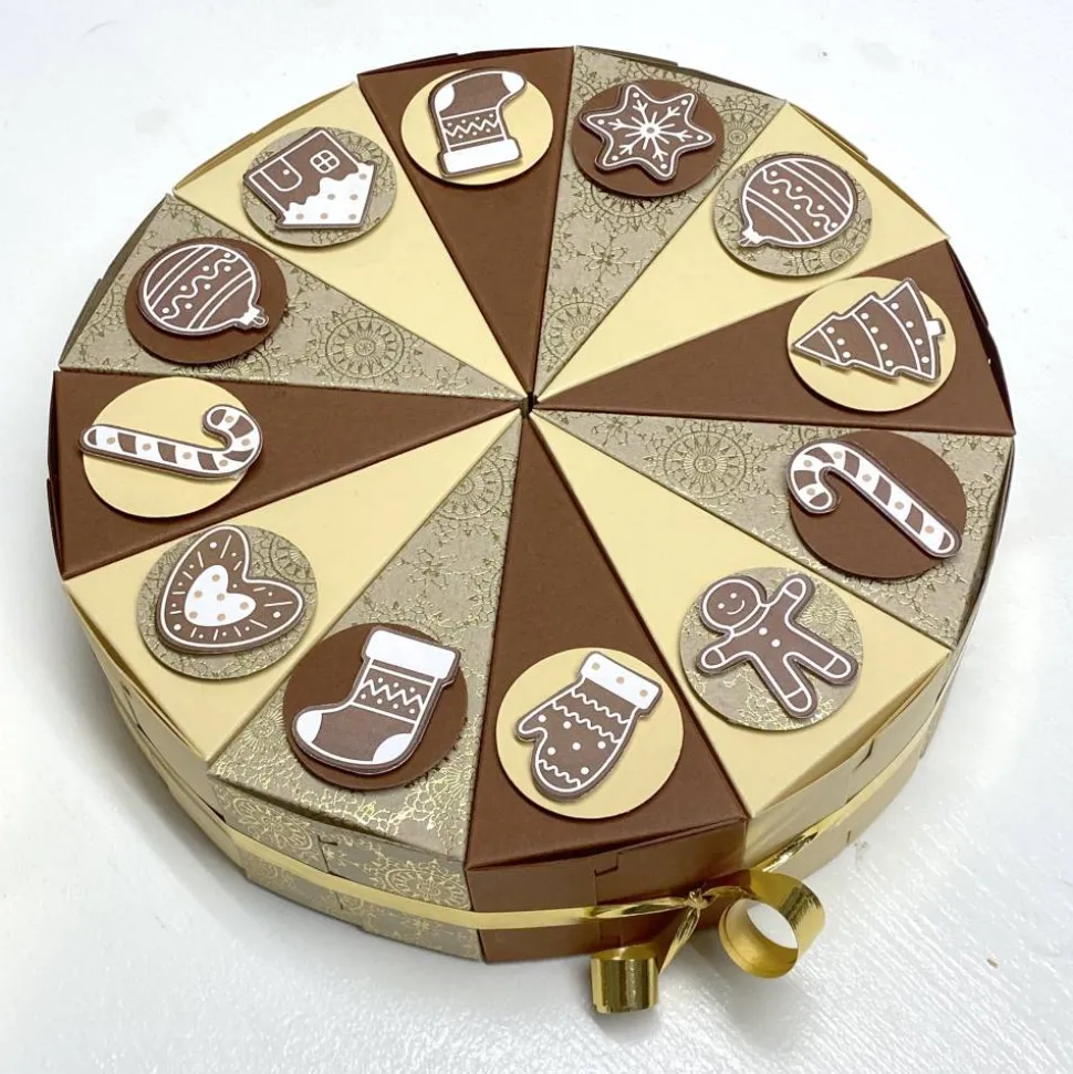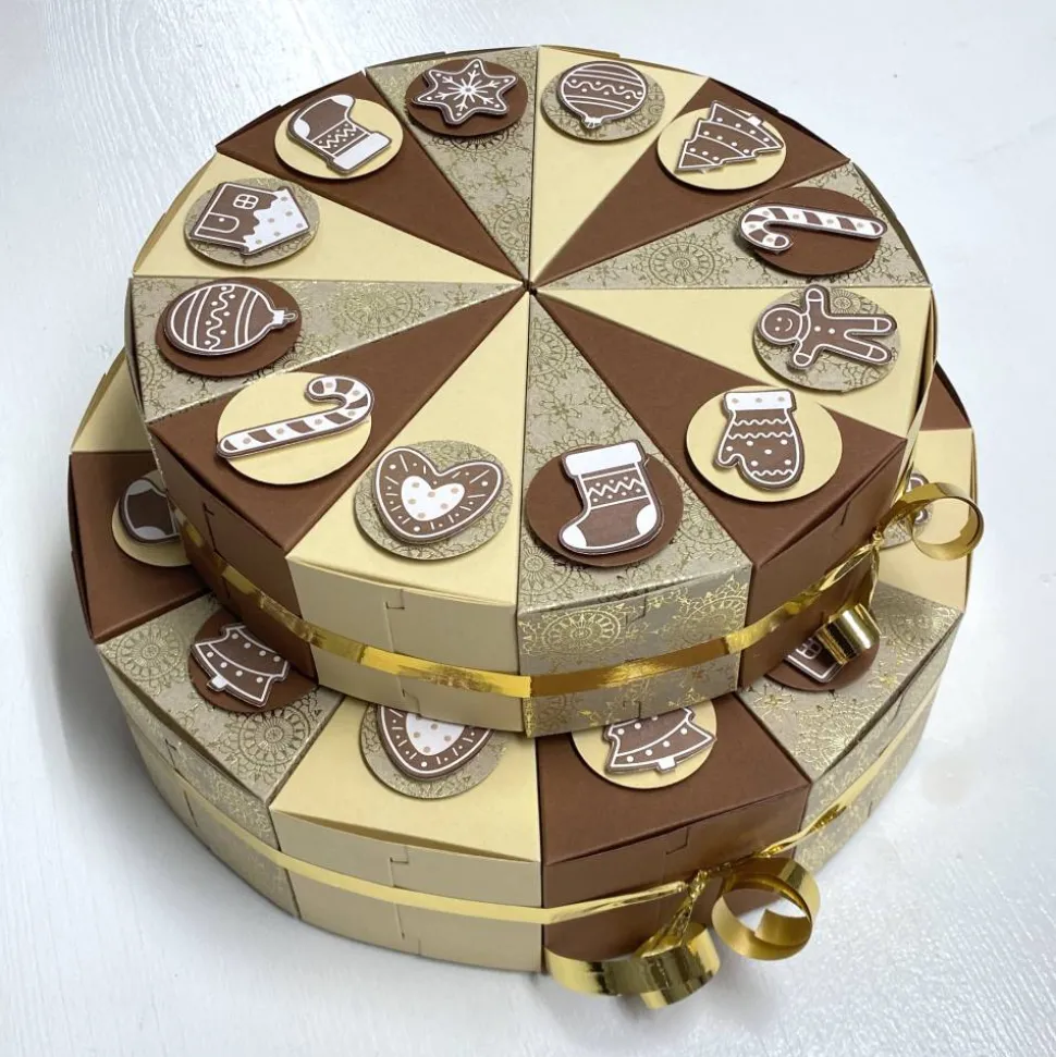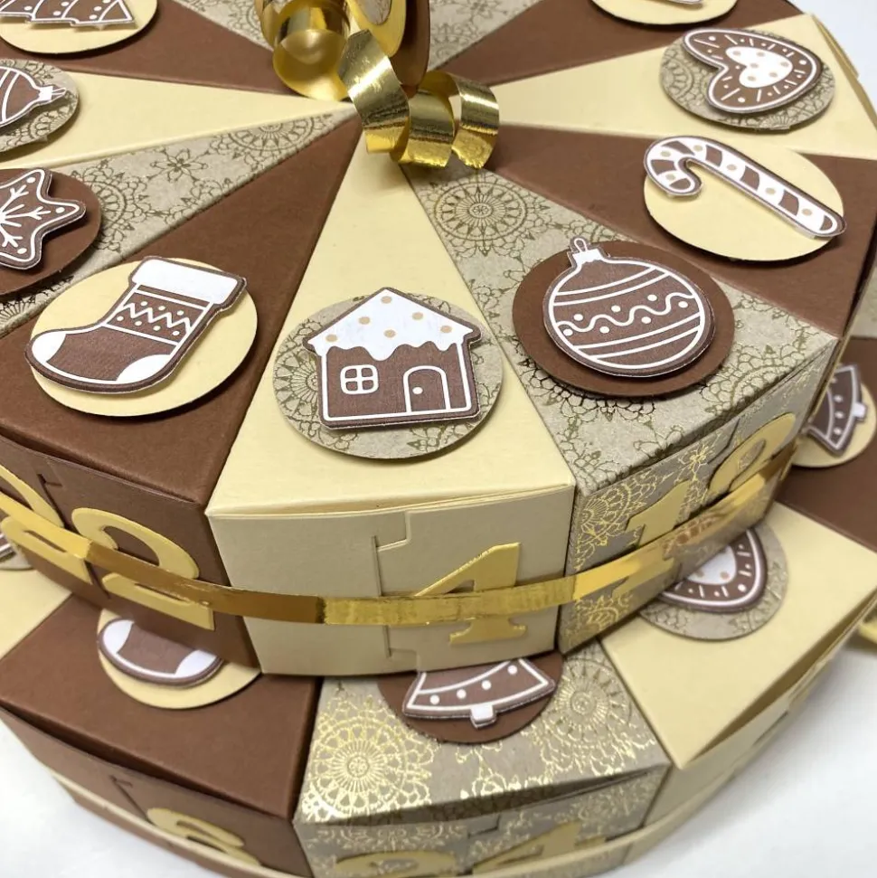 Diese als zweistöckige Torte arrangierte Adventskalender Verpackung ist mit Zahlen von 1 bis 24 versehen, so dass Sie für jeden Tag in der Adventszeit ein separates Geschenkfach haben. Die beiden Stockwerke sind mit einer Band, hübschen Figuren und mit hübschen Motive je nach Thema dekoriert.