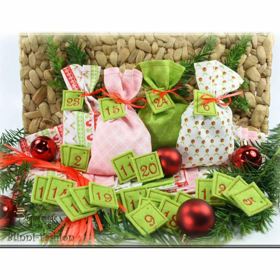 Traumhafter Adventskalender bestehend aus 24 liebevoll genähten Säckchen aus weihnachtlichen Designstoffen von Riley Blake mit Adventskalender-Zahlen in hellgrün bestickt mit den Zahlen von 1 – 24 und natürlich das passende Satinband zum Binden.