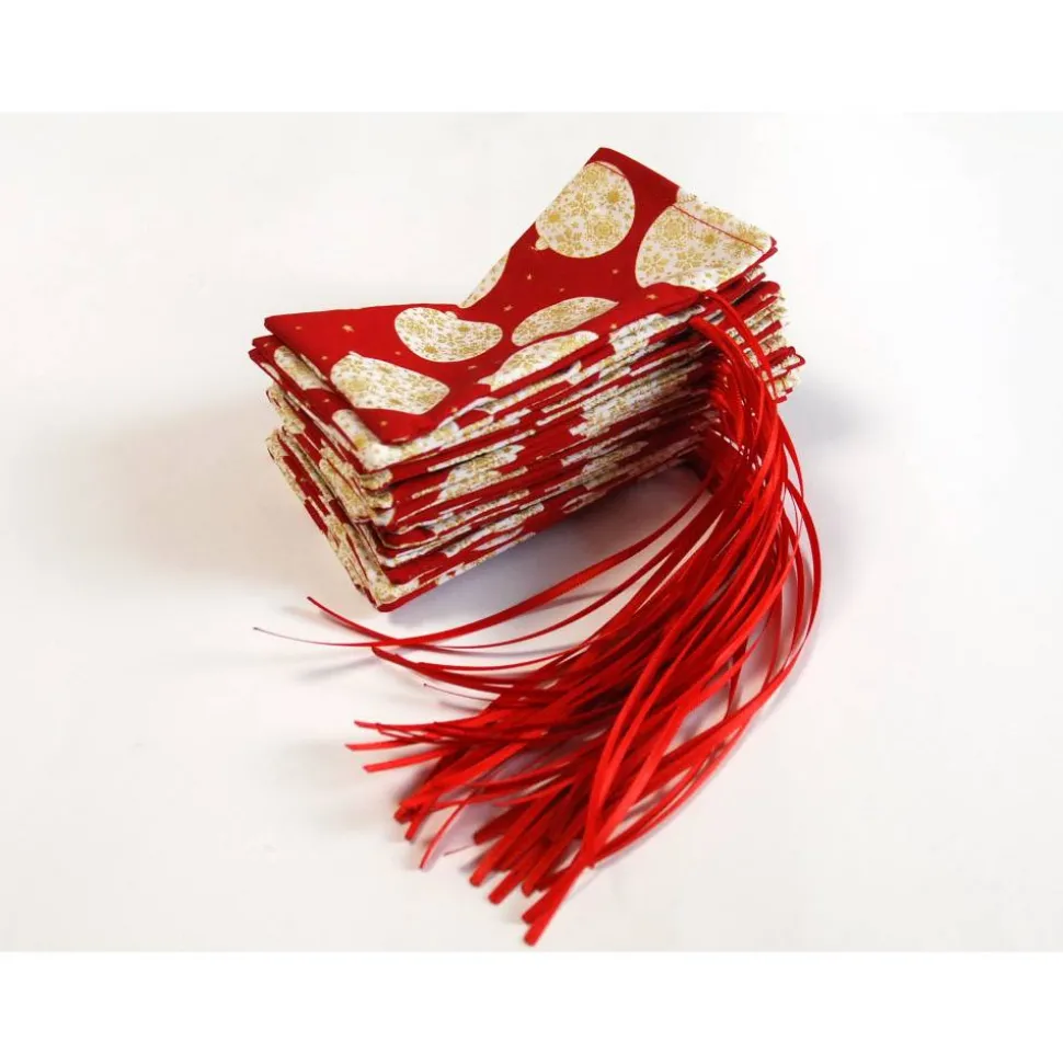 Gebunden werden die Säckchen mit roten Satinbändchen. Damit diese nicht verloren gehen, sind sie in der seitlichen Naht eingenäht.