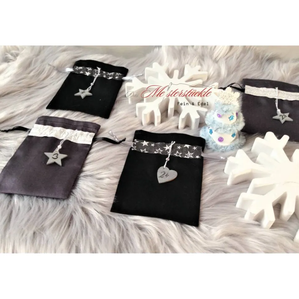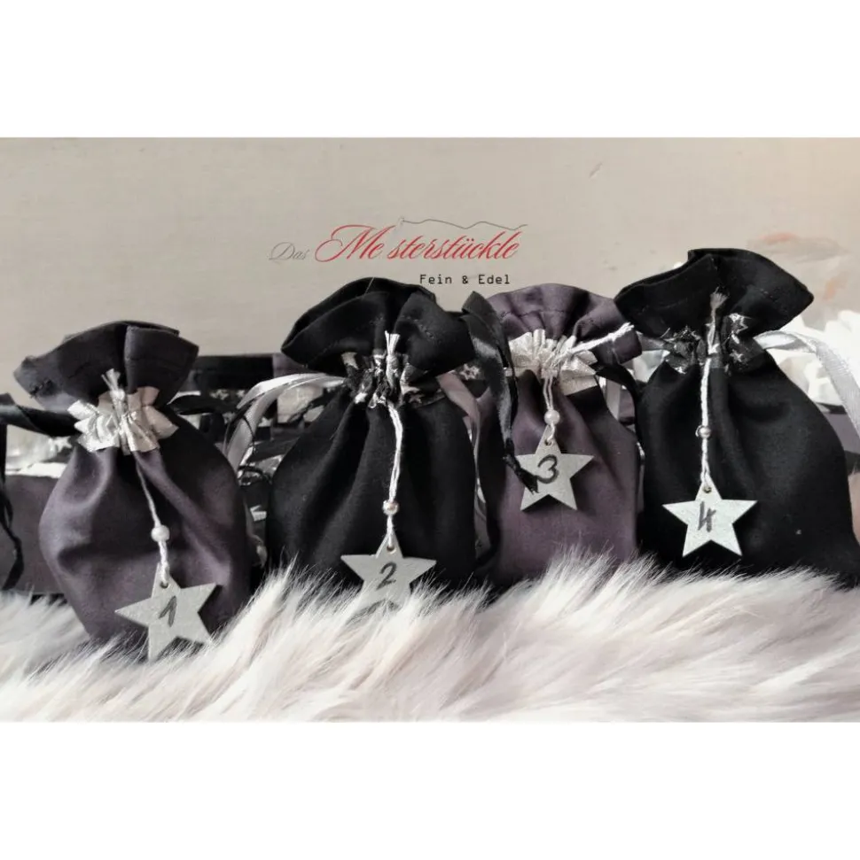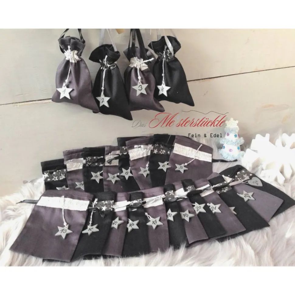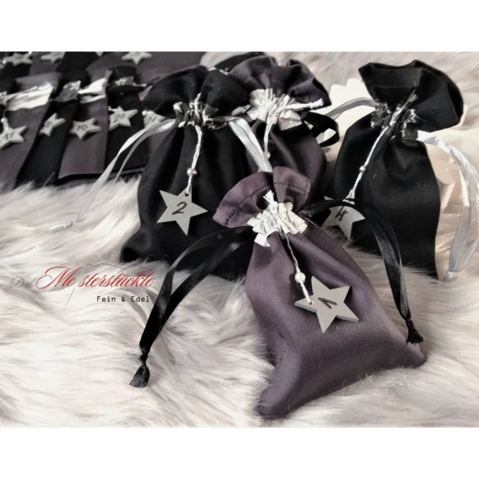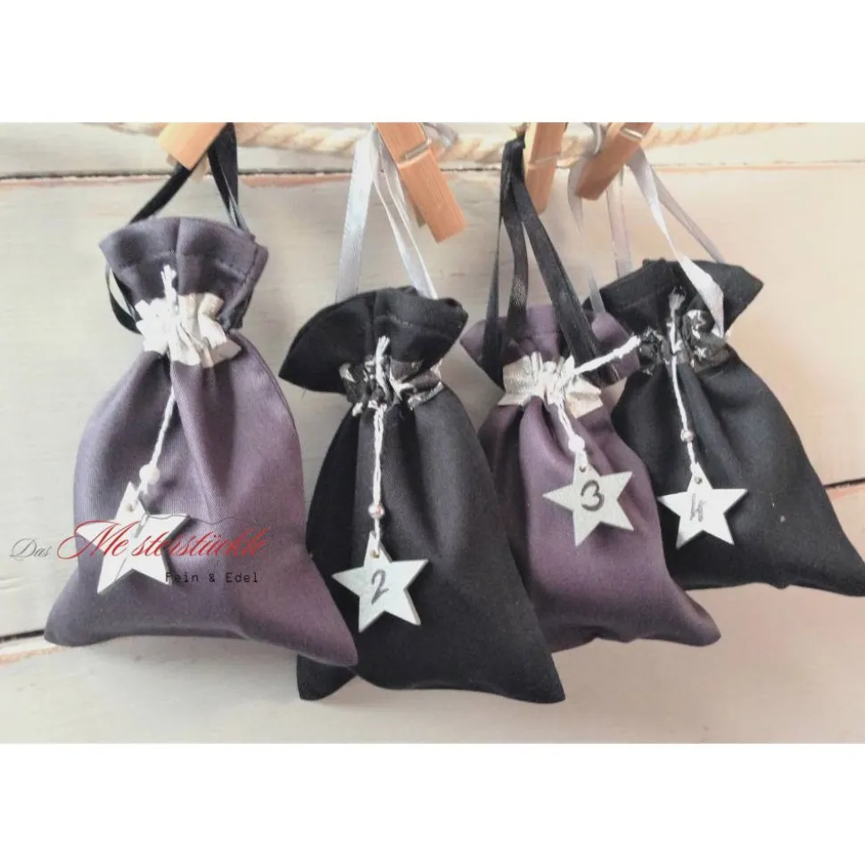 Die Adventskalendersäckchen sind aus glänzendem Baumwollsatin handgemacht. Sie verleihen Deinem Zuhause Exklusivität. Handgefertigte Adventskalendersäckchen können ganz individuell befüllt werden.