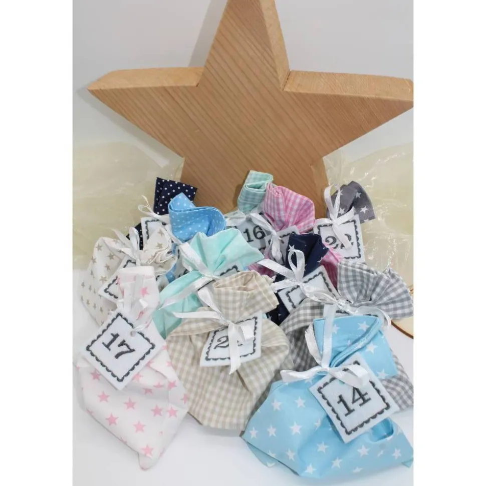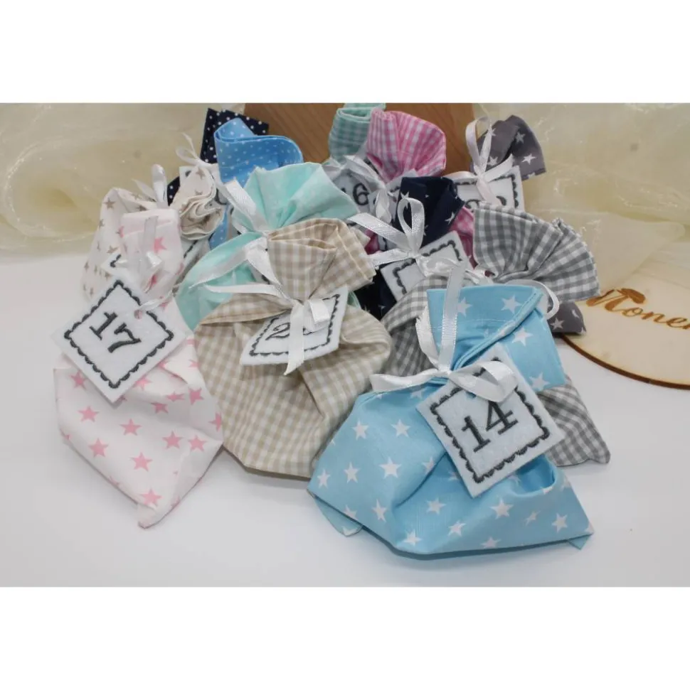 Das Set besteht aus 24 Säckchen (4x dunkelblau, 4x mint, 4x grau, 4x rosa, 4x hellblau und 4x beige), 24 bestickte Zahlen aus Filz und 24 Satinbändchen.