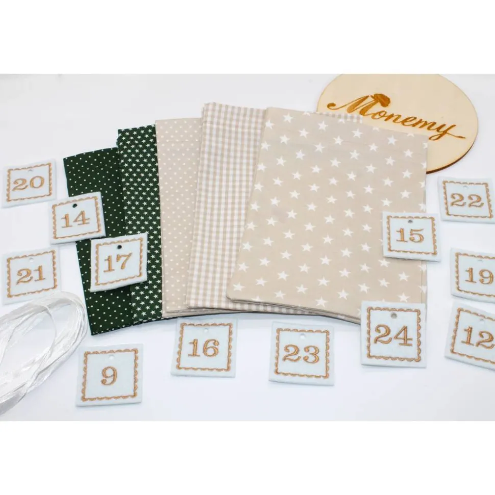 Das Set besteht aus 24 Säckchen in dunkelgrün beige, 24 bestickte Zahlen aus Filz und 24 Satinbändchen.