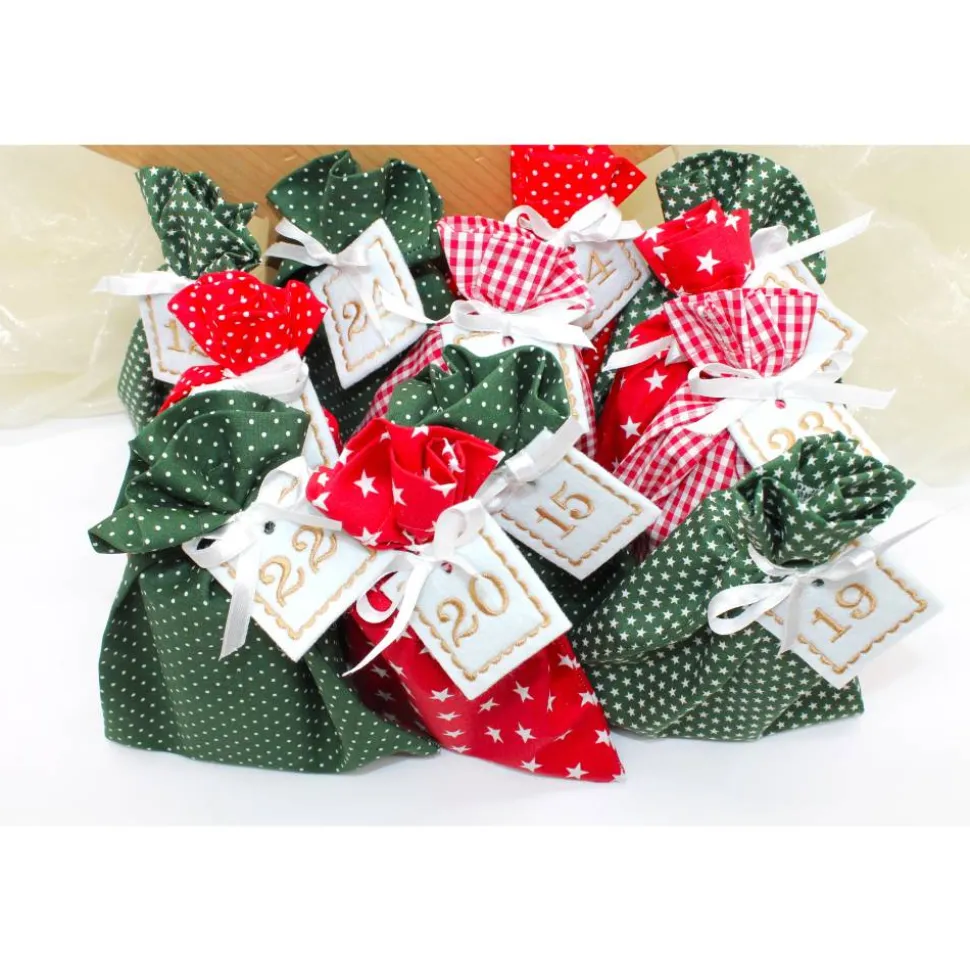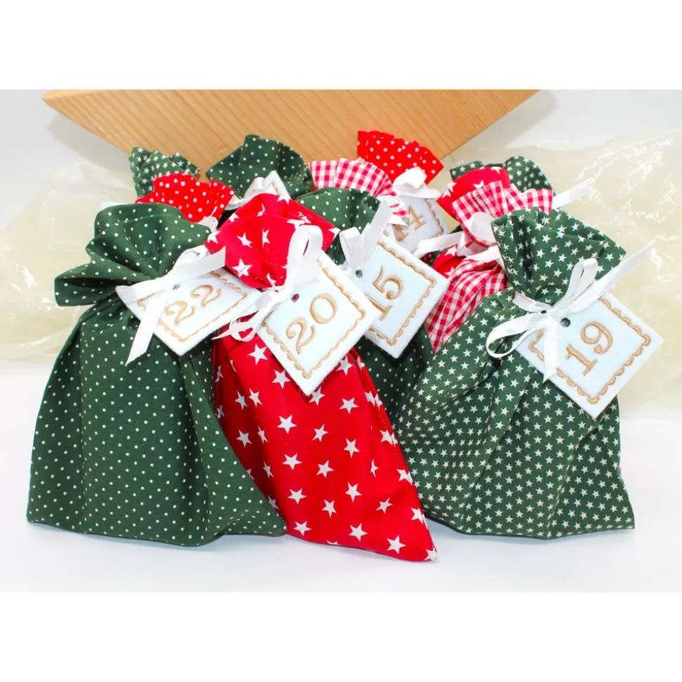 Das Set besteht aus 24 Säckchen in dunkelgrün rot, 24 bestickte Zahlen aus Filz und 24 Satinbändchen.