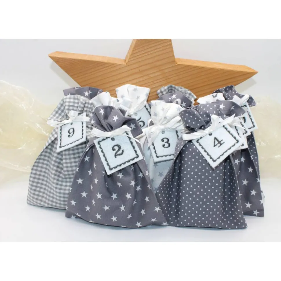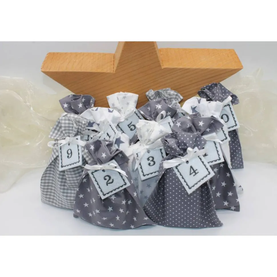 Das Set besteht aus 24 Säckchen, 24 bestickte Zahlen aus Filz und 24 Satinbändchen.