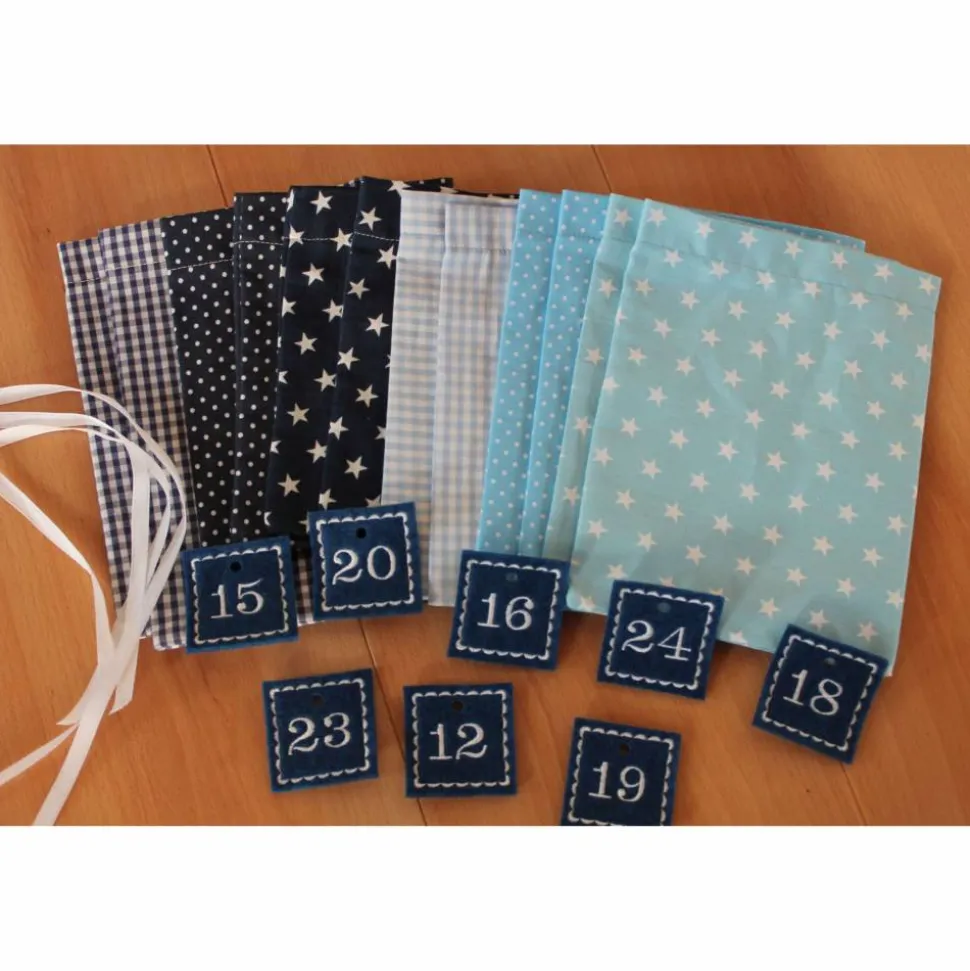 Das Set besteht aus 24 Säckchen (12x hellblau und 12x dunkelblau), 24 bestickte Zahlen aus Filz und 24 Satinbändchen.