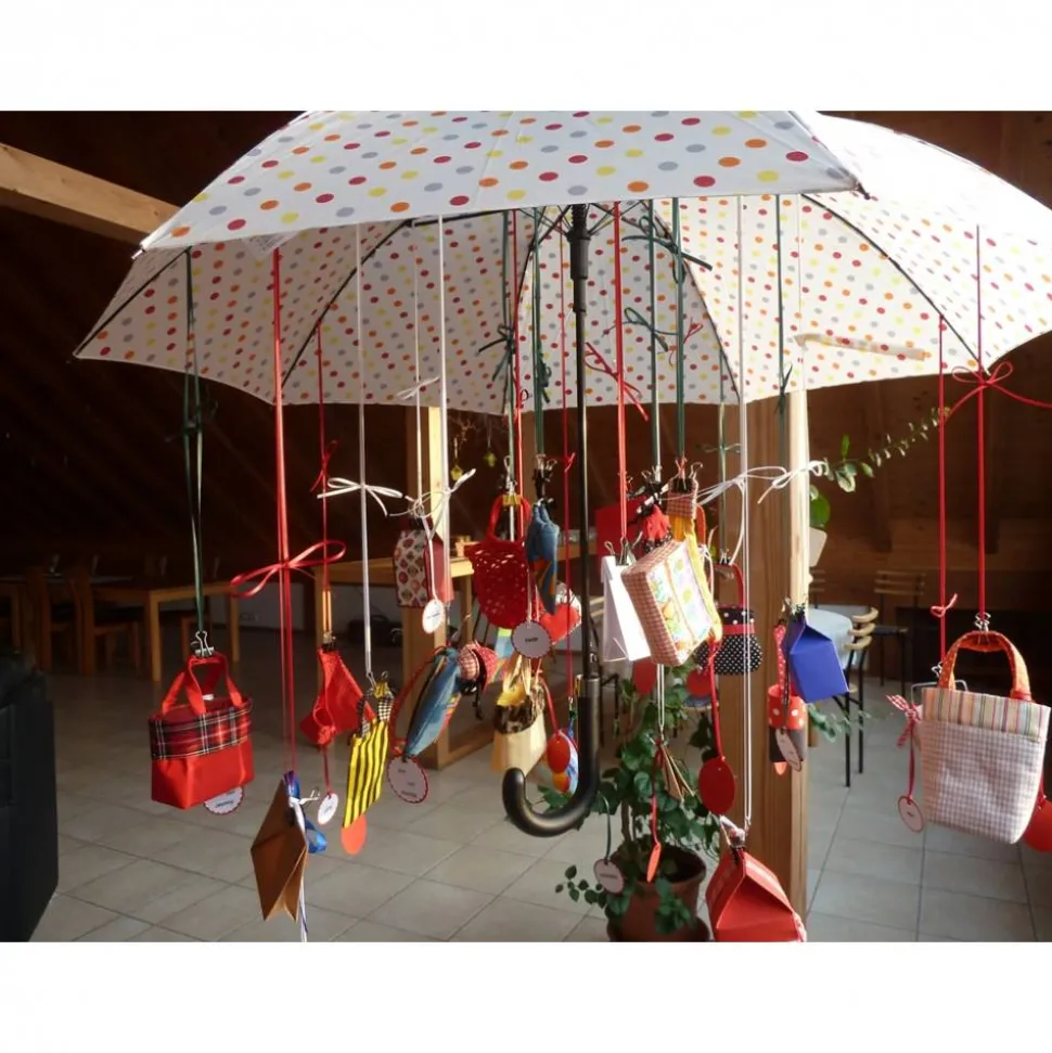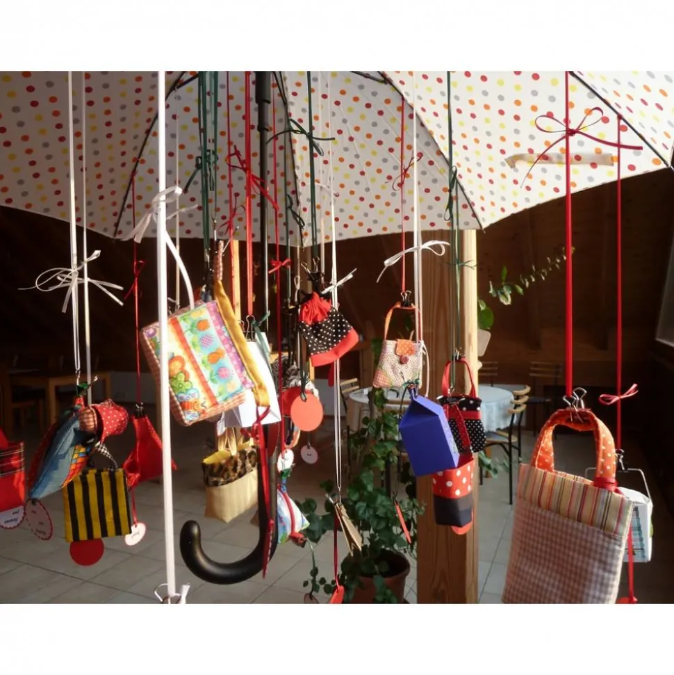 Die Taschen etc. sind an einem Automatikschirm aufgehängt der an einer Nylonschnur hängt in die ich mehrere Knoten angebracht habe, somit kann man mit der Aufhänghöhe variieren und es entsteht der Eindruck eines schwebenden Schirms.