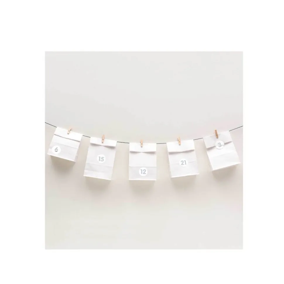 Alle freuen sich über einen selbstgemachten Adventskalender! Dieses Set macht es ganz einfach: Es enthält 24 weiße Papiertüten, Holzklammern, Zahlenaufkleber und schwarzes Garn. Die Tüten können auch mit Aufklebern und Geschenkanhängern verschönert werden. Danach müssen sie nur noch befüllt werden. So entsteht schnell ein selbstgemachter Adventskalender, der nicht nur praktisch ist, sondern auch schön aussieht! Die Tüten können nach Belieben dekoriert und als Girlande aufgehängt werden.