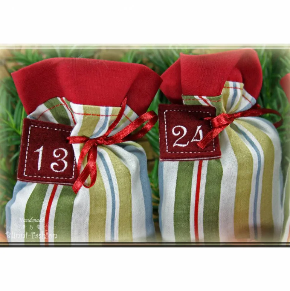 Wunderschöner Adventskalender bestehend aus 24 liebevoll in Handarbeit hergestellten Säckchen aus verschiedenen Baumwollstoffen. Zu den Adventskalendersäckchen bekommst du auch die auf Filz gestickten Adventskalenderzahlen und Satinband zum Binden.