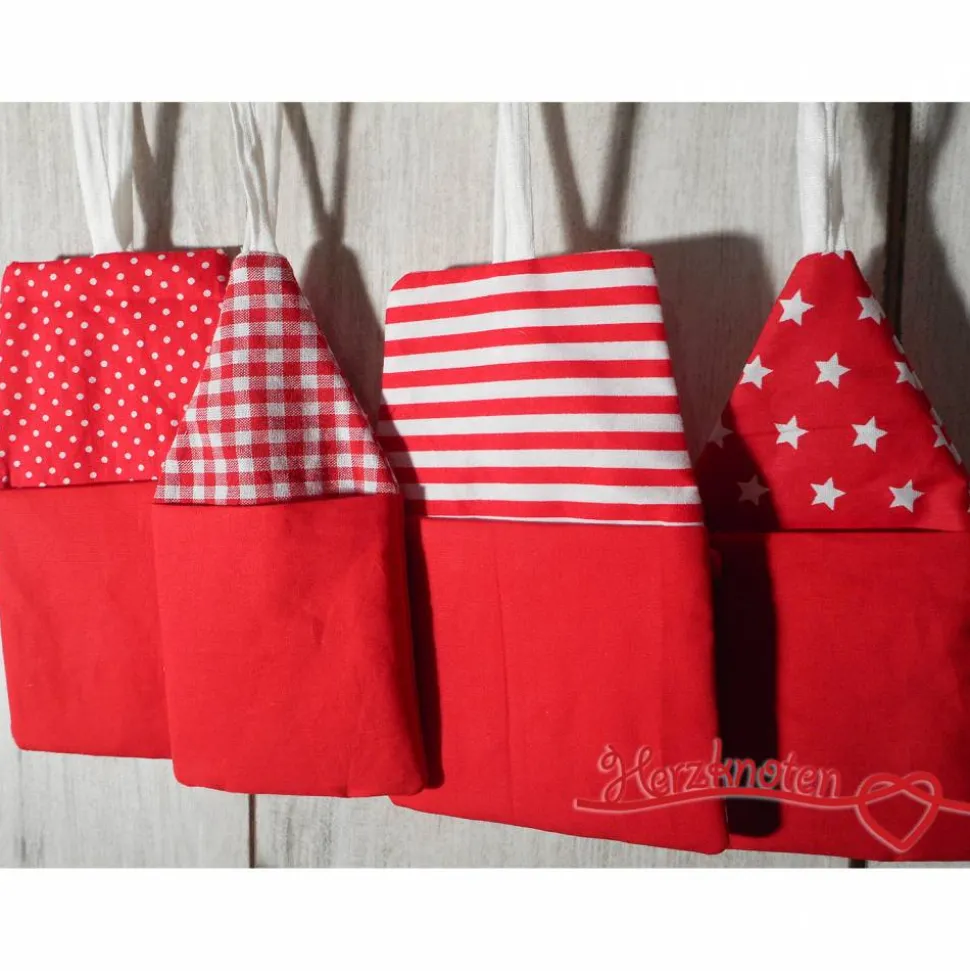 Dieser Adventskalender besteht aus 24 genähten „Häuschen“, die aufwendig bestickt, mit Zahlen versehen und mit Bändern verziert worden sind. Die Stoffe sind alles hochwertige Baumwollstoffe, mit Vlies hinterlegt zur besseren Stabilität mit den verschiedenensten Mustern , alles in rot-weiß gehalten. Hinten an dem Häuschen ist eine kleine Tasche zu befüllen, mit Süßigkeiten, kleinen Geschenken, Loosen, Pflegeprodukten, Briefchen oder was auch immer. Die Tasche ist immer aus rotem Stoff. Mit dem angenähten Band können die Häuschen überall aufgehängt werden, an einer Leine, am Treppengeländer, an einem schönem Ast , die Möglichkeiten sind unbegrenzt. Jedes Häuschen ist unterschiedlich und auch kein Kalender ist gleich, alles Unikate. Die Stoffe auf den Fotos können varieren, ergeben aber immer den gleiche harmonischen Gesamteindruck.