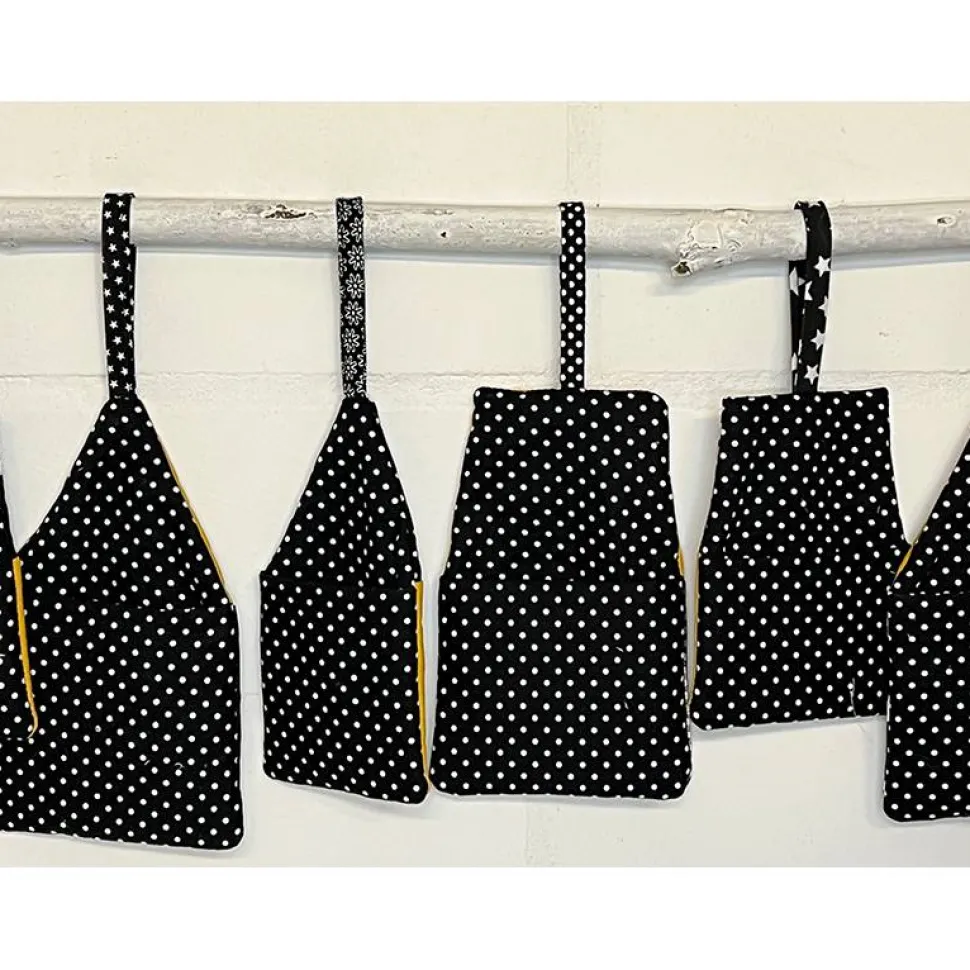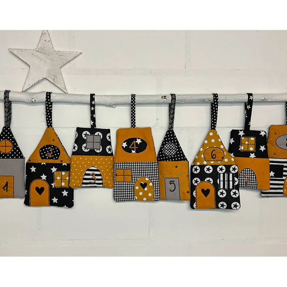 Dieser Adventskalender besteht aus 24 genähten „Häuschen“, die aufwendig bestickt in schwarz oder senf, mit Zahlen versehen und verziert worden sind. Die Stoffe sind alles hochwertige Baumwollstoffe, mit Vlies hinterlegt zur besseren Stabilität mit den verschiedenensten Mustern , alles in senf-schwarz-weiß-grau gehalten. Hinten an dem Häuschen ist eine kleine Tasche zu befüllen, mit Süßigkeiten, kleinen Geschenken, Loosen, Pflegeprodukten, Briefchen oder was auch immer. Die Rückseite ist immer aus schwarz-weiß klein gepunktetem Stoff. Mit dem angenähten Band können die Häuschen überall aufgehängt werden, an einer Leine, am Treppengeländer, an einem schönem Ast , die Möglichkeiten sind unbegrenzt. Jedes Häuschen ist unterschiedlich und auch kein Kalender ist gleich, alles Unikate. Die Stoffe auf den Fotos können varieren, ergeben aber immer den gleiche harmonischen Gesamteindruck.