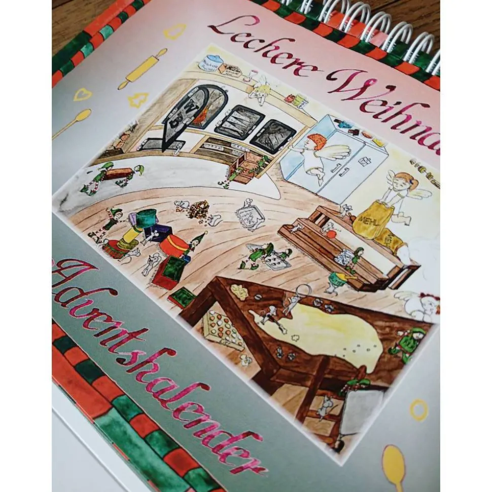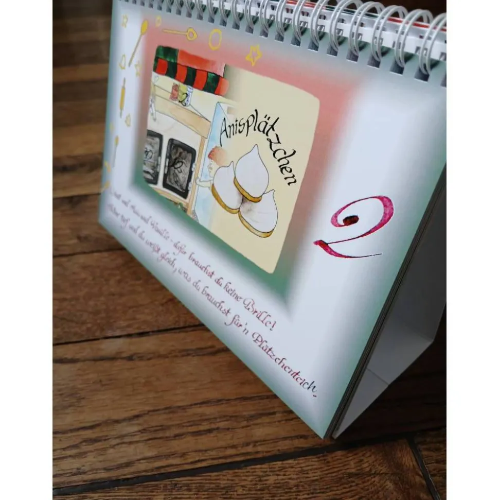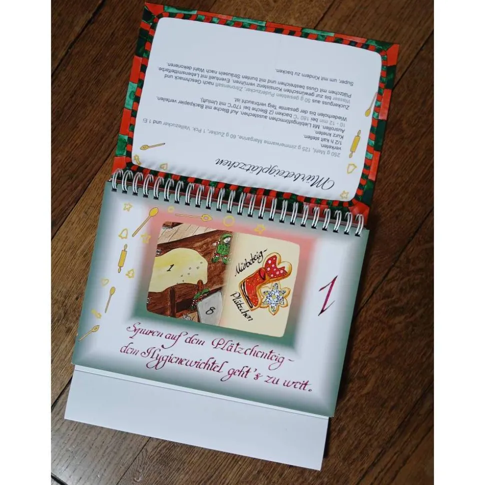 Jeden Tag darf eine neue Seite vom Kalender umgeblättert werden. Zu sehen ist ein vergrößerter Bildausschnitt und eine Weihnachtsleckerei. Das entsprechende Rezept ist auf der Rückseite des Kalenders aufgeschlagen.