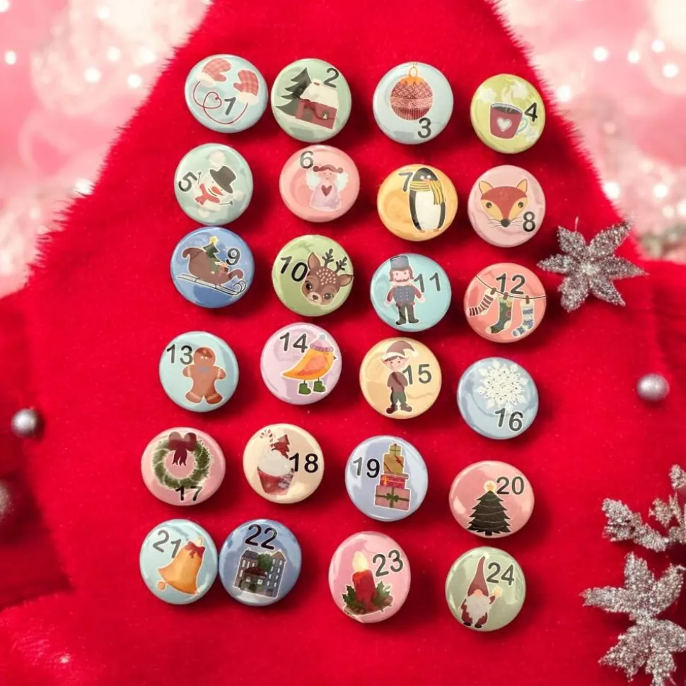 Mach Deinen Adventskalender zu etwas ganz Persönlichem und Einzigartigem – mit diesem liebevoll gestalteten 24er Buttons Set!