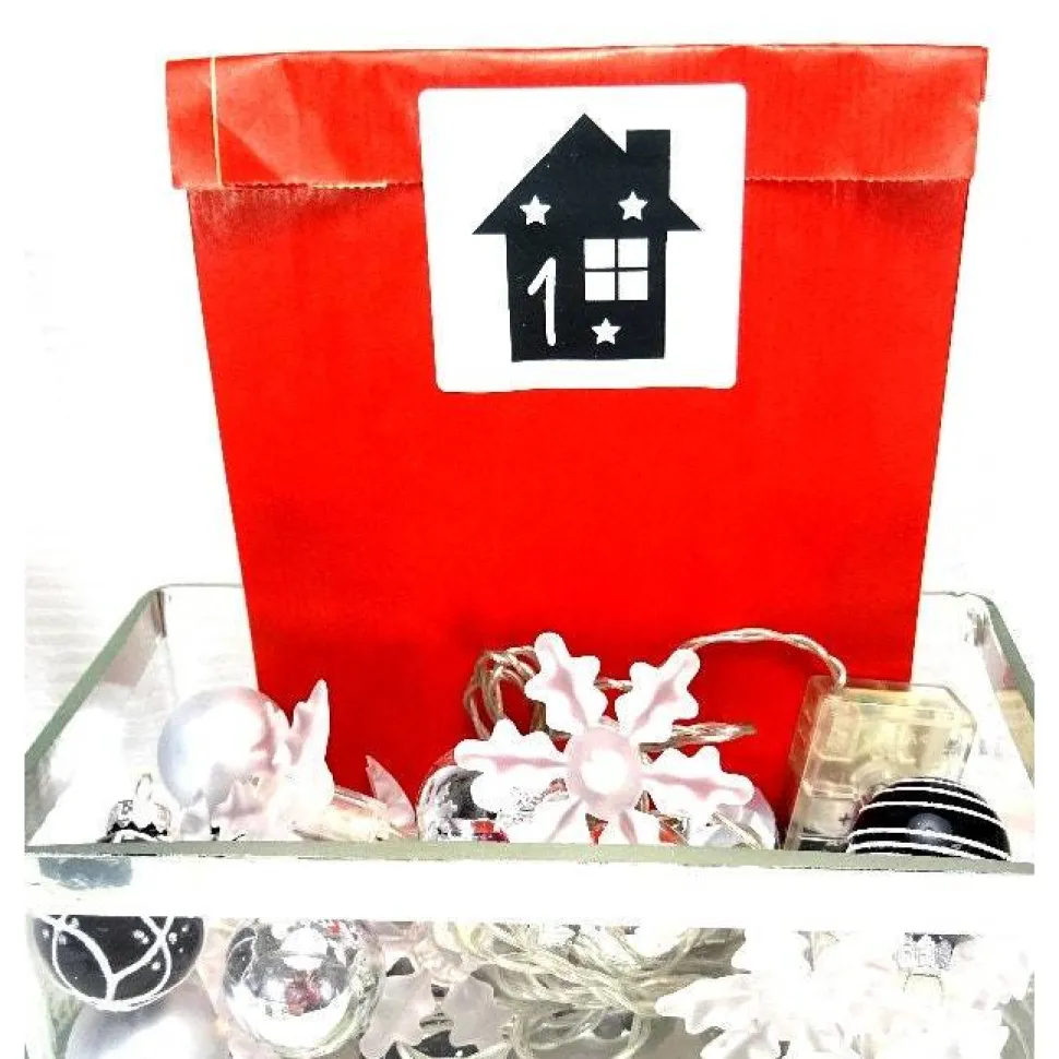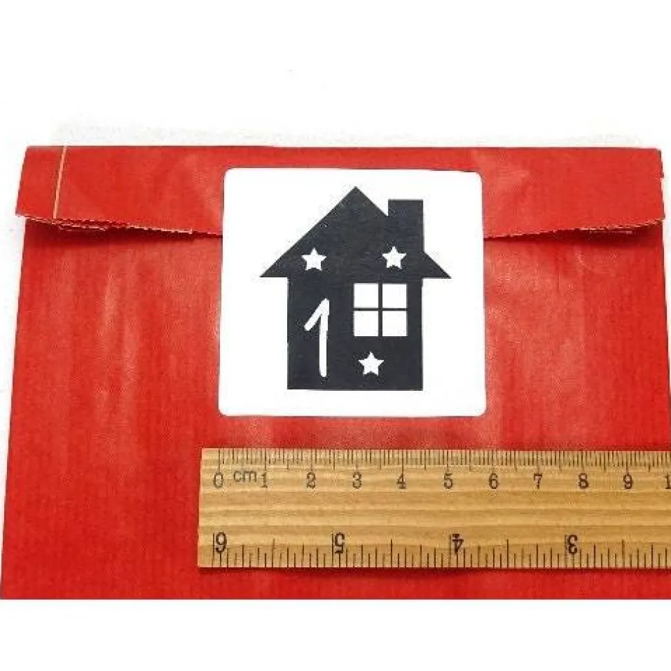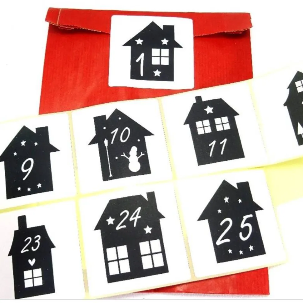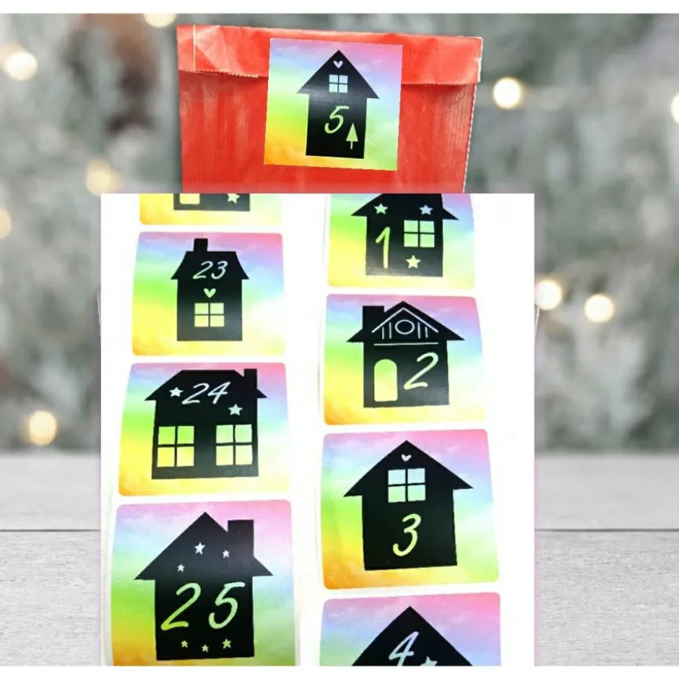 TIPP: Gestalte deinen Adventskalender mit Tüten, Kraftpapierbeuteln, Schachteln – so entsteht mit den Häuser-Stickern dein Advents-Winterdorf.