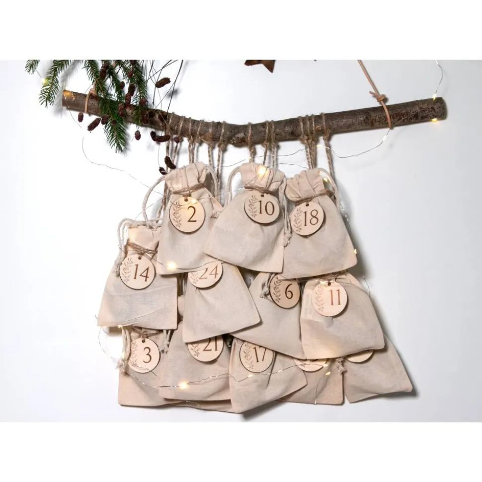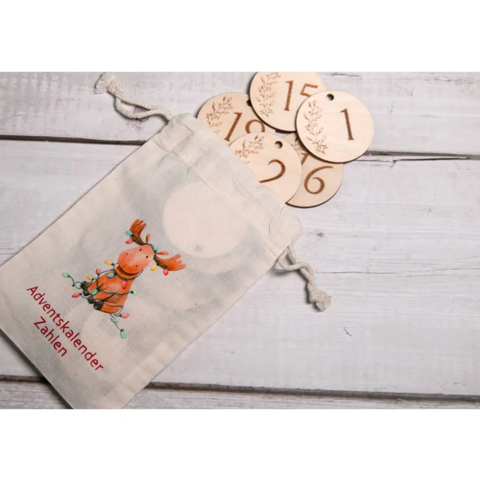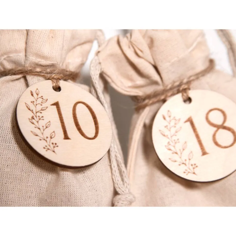Mit diesen handgefertigten Adventskalender-Zahlen aus Holz gestaltest duBeutel, Päckchen oder Girlanden schlicht und stilvoll. Das Set umfasst dieZiffern 1–24 als runde Anhänger. Jede Scheibe wird präzise gelasert und miteiner zarten, seitlichen Ranke graviert – ein ruhiges, skandinavischinspiriertes Design, das zu modernem und klassischem Weihnachtsschmuck passt.