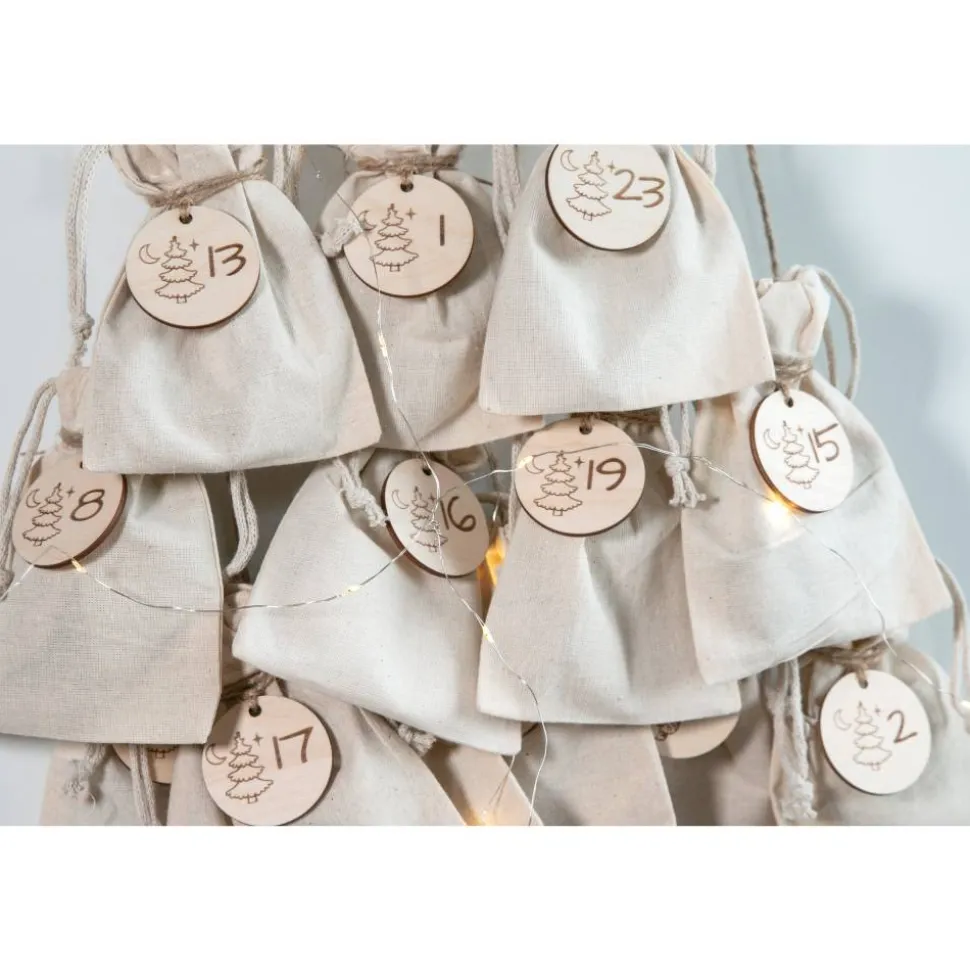 • 24 runde Holzanhänger (Zahlen 1–24) mit Tannenbaum-Gravur