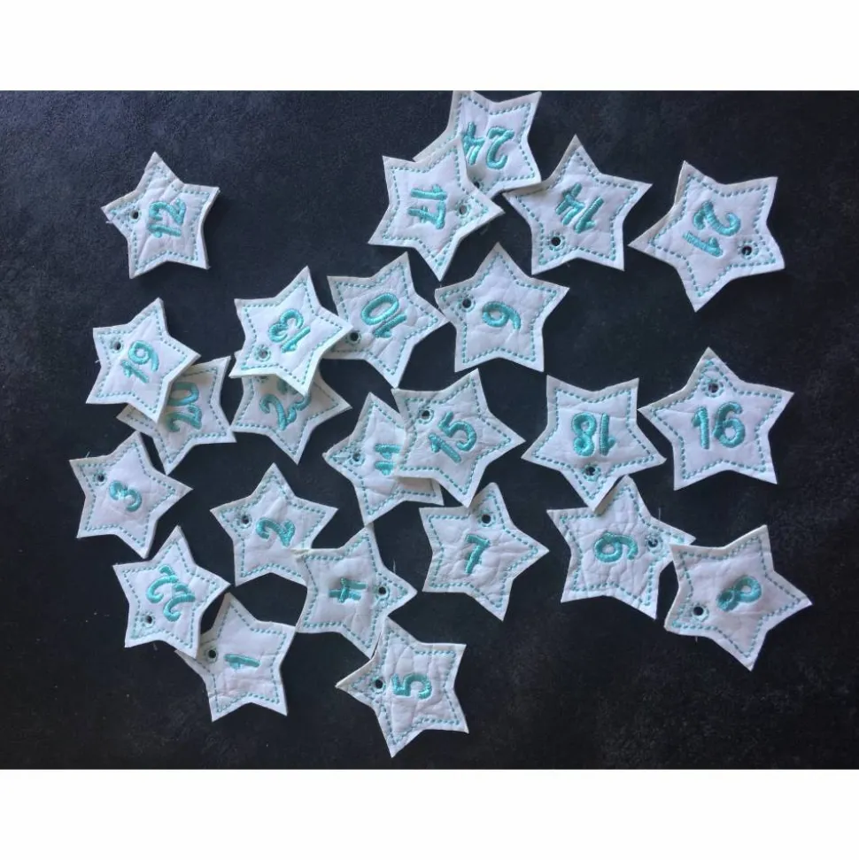 Da bald Weihnachten ist und immer so unverhofft kommt sind heute diese tollen Adventskalender zahlen entstanden. Die Sterne sind aus Kunstleder und jedes Jahr aufs neue verwendbar…. die Sterne sind 4×4 cm groß….. gerne auch in anderen Farben bestickbar…. stickdatei by Himbeerdesign
