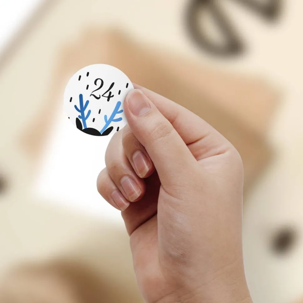Gestalten Sie einen ganz persönlichen Adventskalender für ihre Liebsten mit unserem liebevoll gestalteten Stickerbogen. Der A4-Bogen enthält 24 runde Aufkleber mit den Zahlen 1 bis 24 und festlichen Motiven in einer edlen Farbkombination aus Schwarz und Blau. Die Zahlenaufkleber eignen sich perfekt zum verzieren von Geschenken oder zum verschließen von Geschenktüten. Die selbstklebenden Sticker haben einen Durchmesser von 40 mm und haften permanent auf verschiedenen Oberflächen.