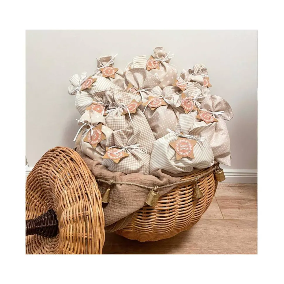 Die 24 Säckchen unseres Adventskalender zum Befüllen in XL bieten mit 15×20 cm reichlich Platz zum Verstauen kleiner Geschenke und Leckereien. Die Tütchen haben ein eingenähtes Satinband zum Verschließen, dass somit nicht verloren gehen kann. Jeweils sechs Säckchen sind im gleichen Muster genäht. Zum Lieferumfang gehören zusätzlich 24 Pappsterne aus Kraftpapier mit Loch zum Einfädeln des Satinbands und 24 Zahlenaufkleber.
