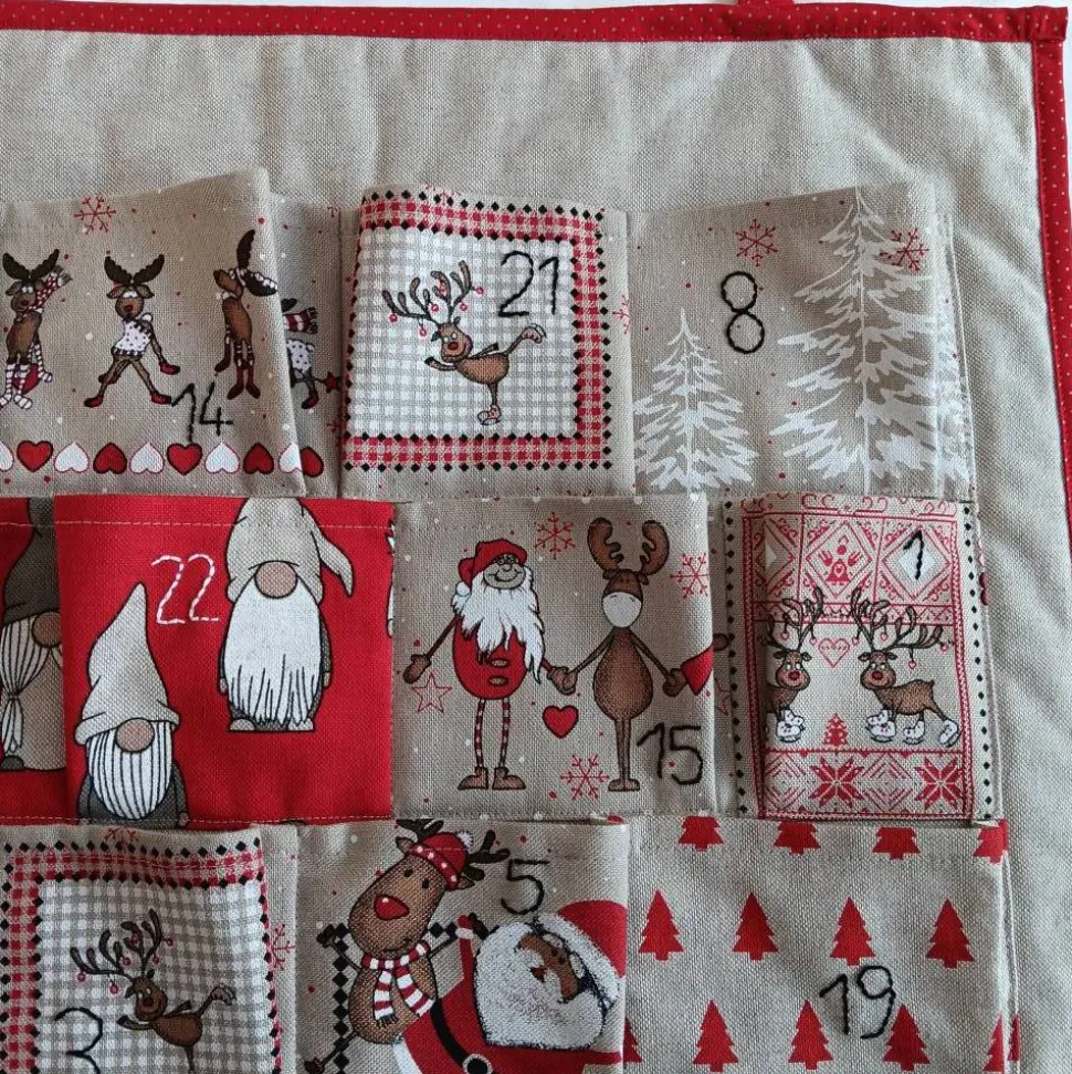 Dieser tolle Adventskalender ist ein echtes Schmuckstück. Wichtel tanzen mit Rentieren durch den Wald. Die vielen aufgenähten Täschchen aus unterschiedlichen Stoffen können nach Belieben selbst mit Süßem, Gutscheinen oder sonstigem befüllt werden. Sie haben eine Größe von 10 cm x 8cm (in der Mitte des Wandbehangs) bis 12 cm x 11 cm. Die Nummern sind von Hand mit Sticktwist aufgestickt. Der Hintergrund besteht aus beigem Stoff in Leinenoptik, der mit einer dünnen Lage Volumenvlies gepolstert ist. Die schöne Kante ist rundum mit rotem Baumwollstoff mit goldenen Pünktchen eingefasst. Auf der Rückseite ist oben ein Stofftunnel angenäht, durch den eine Stange zum Aufhängen geschoben werden kann (die Stange gehört nicht zum Lieferumfang). Zusätzlich gibt es 2 Metalösen, an denen man diesen hochwertigen Adventskalender alternativ aufhängen kann. Ohne Deko.