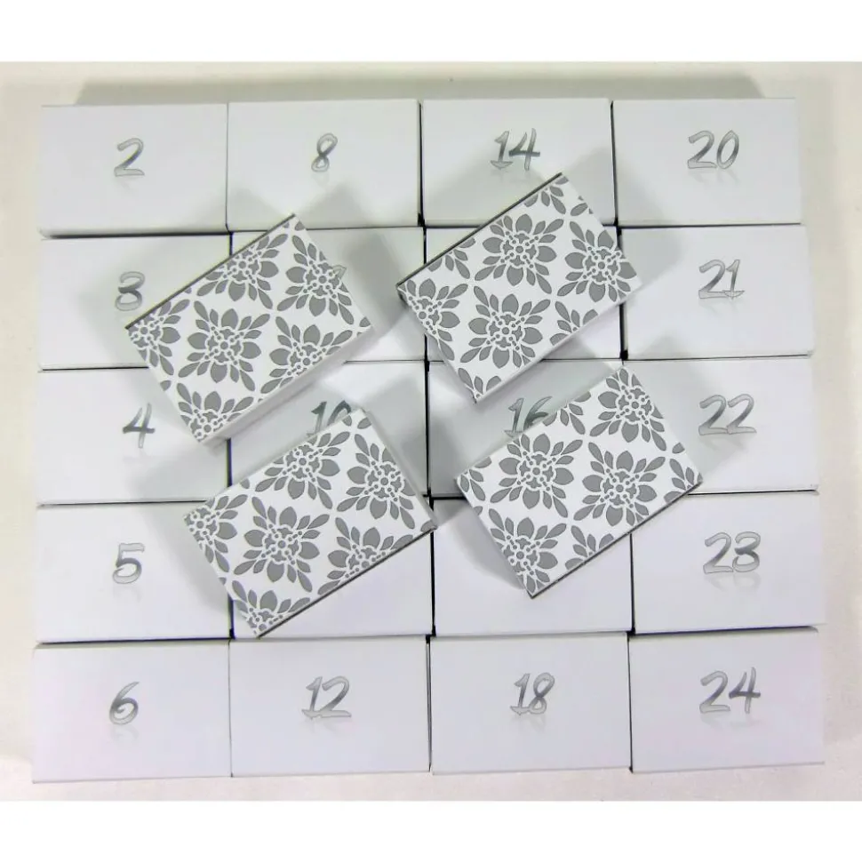 Advent, Weihnachten. Schiebeschachteln mit Kachel-Muster grau, weiß.